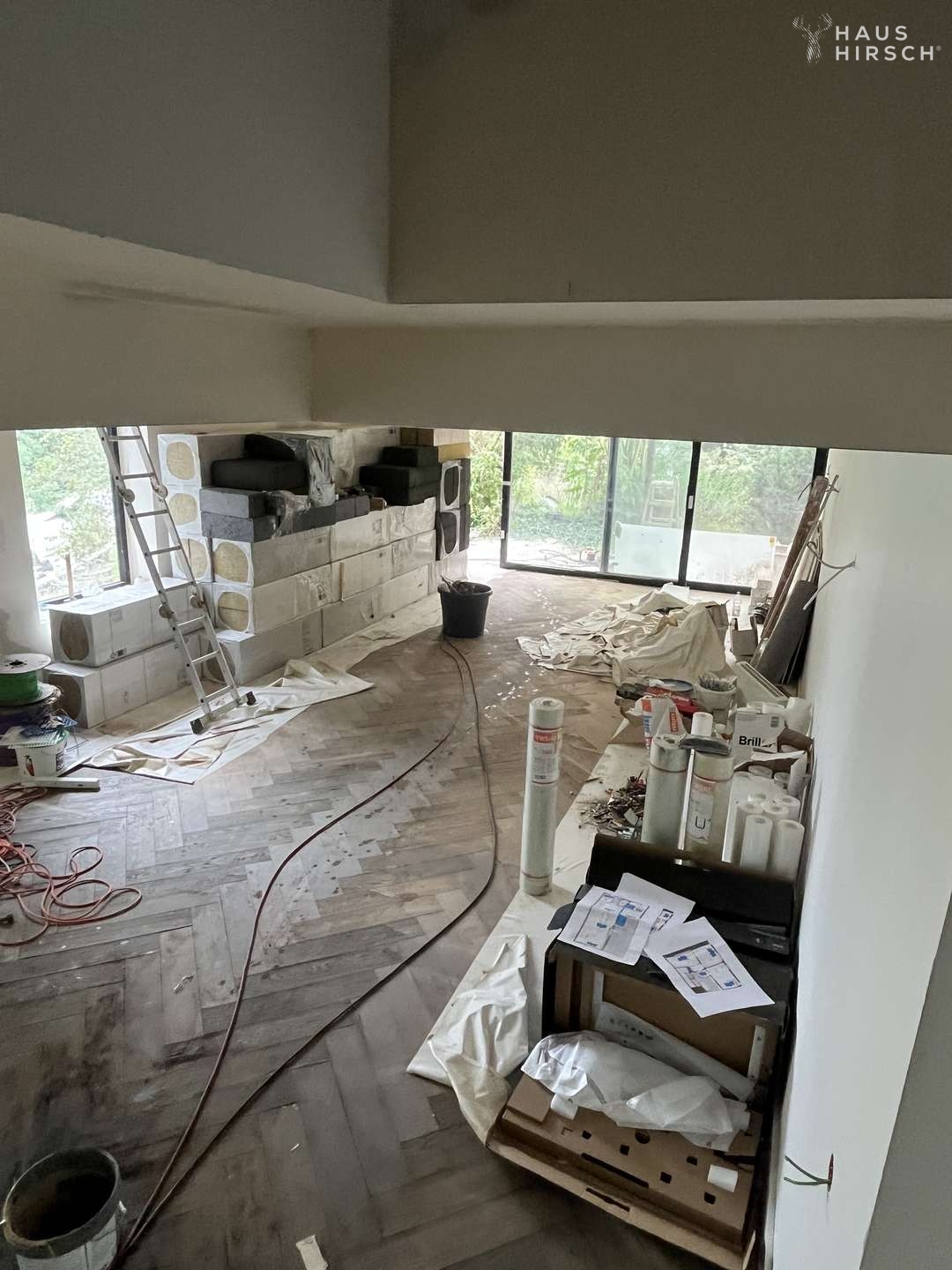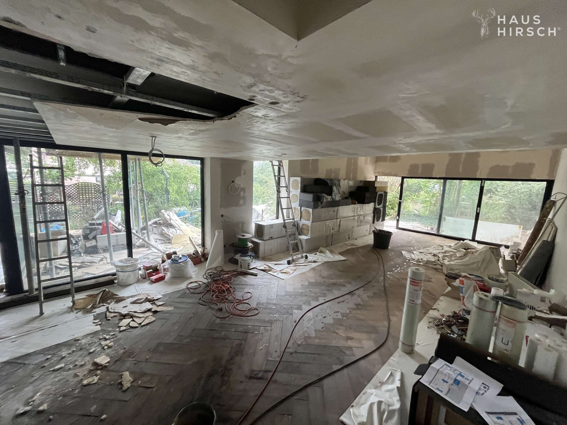 Leider kam es während der Bauphase zu Fehlern der ausführenden Baufirma, die schließlich in Insolvenz ging. In der Folge zog sich ein Rechtsstreit hin, währenddessen das Objekt nicht weiter gepflegt oder fertiggestellt wurde. Dadurch hat das Gebäude heute einen großen Schaden erlitten, der jedoch nicht die solide Substanz oder das architektonische Konzept schmälert.
