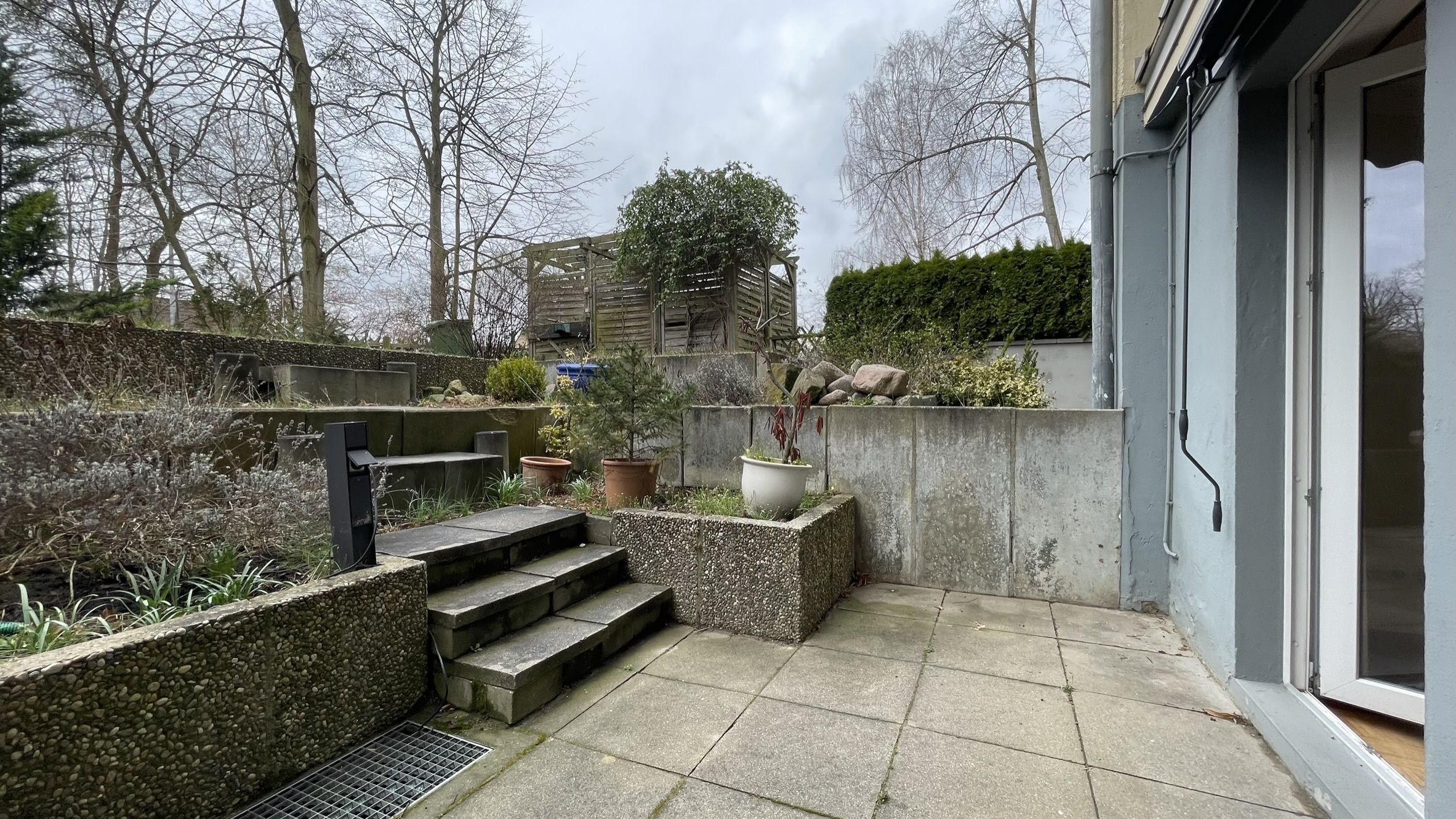 Essbereich, dessen Herzstück die direkte Verbindung zur sonnigen Südwest-Terrasse ist. Hier lassen sich laue Sommerabende in geselliger Runde oder ruhige Morgenstunden mit einer Tasse Kaffee genießen – ein kleines Freiluftparadies, das Ihren Alltag verzaubern wird.