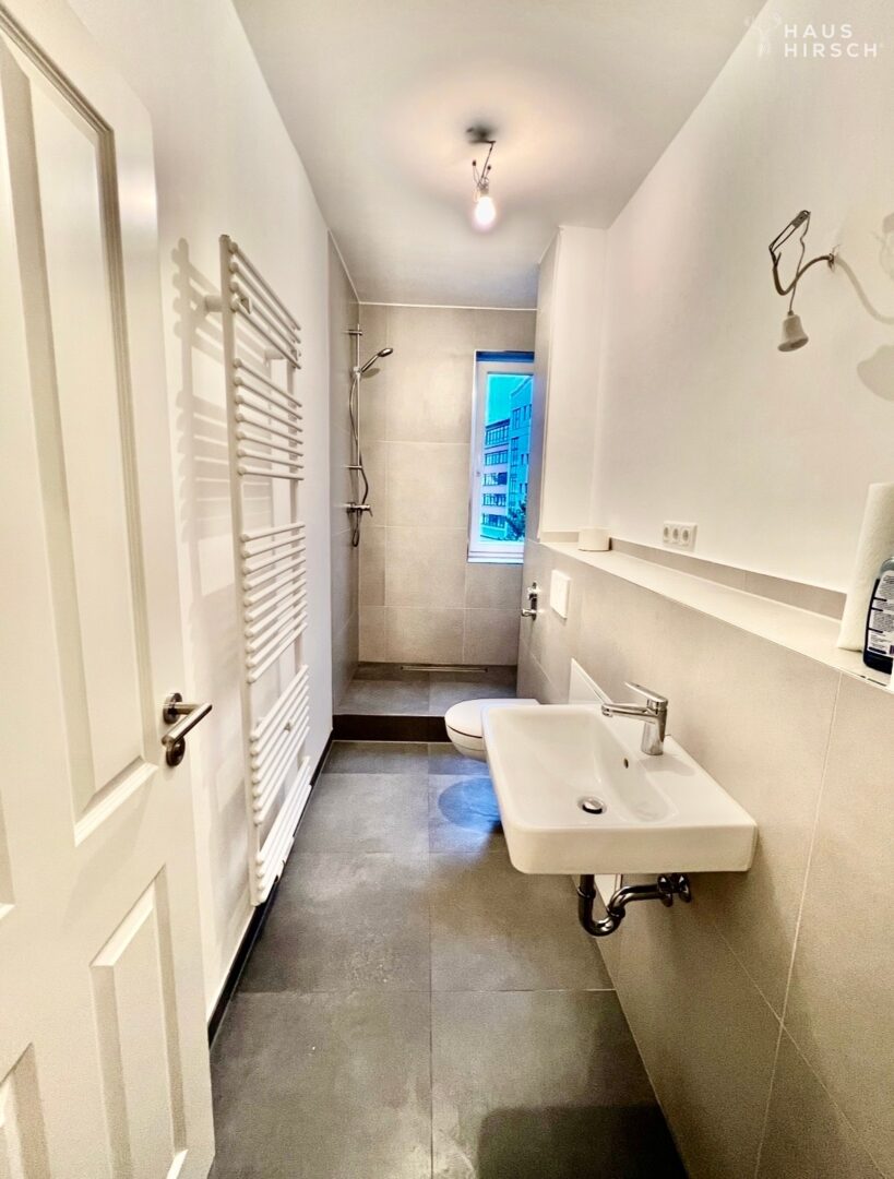 Das Badezimmer präsentiert sich in modernem, zeitgemäßem Design mit bodengleicher Dusche.