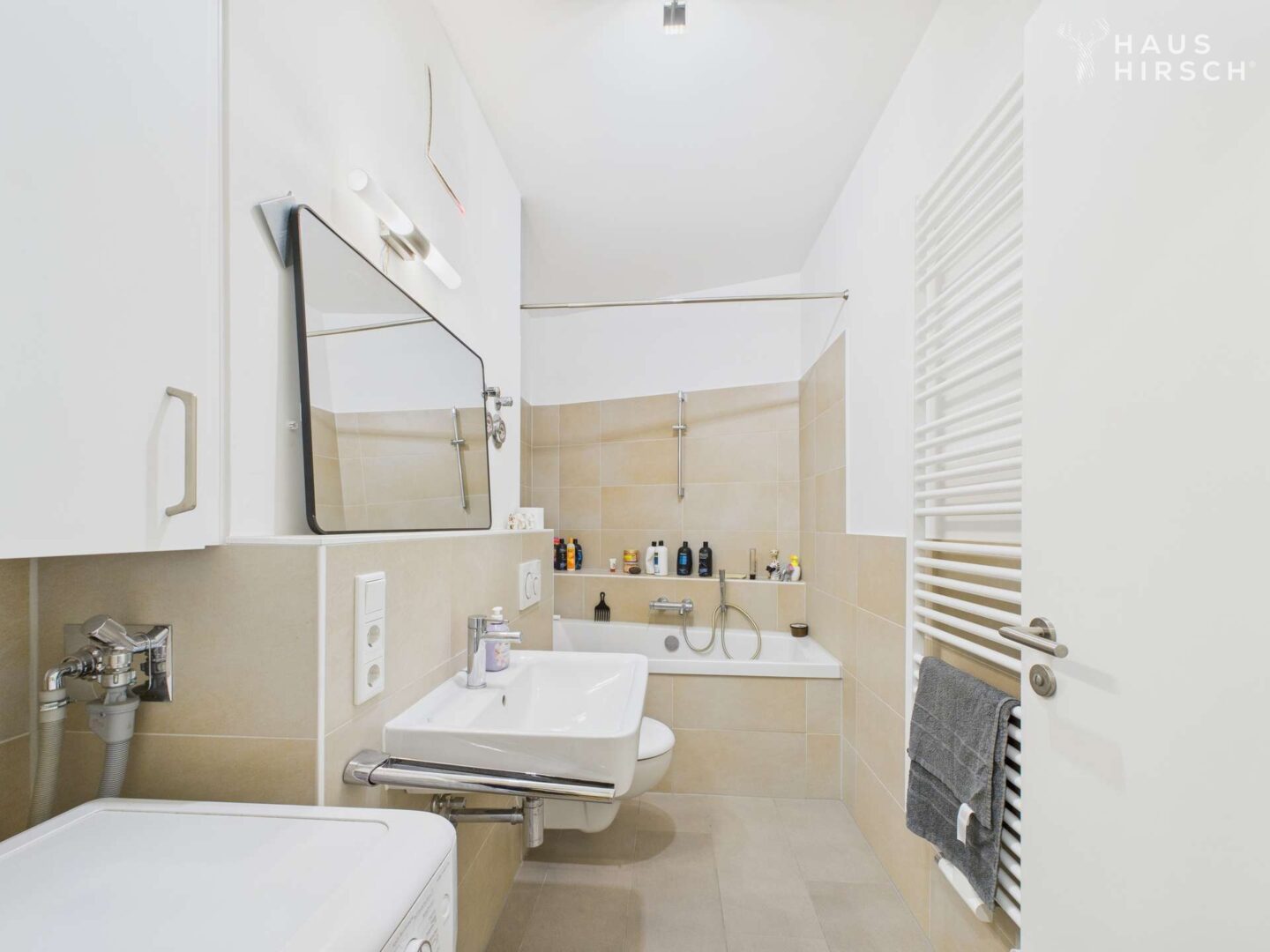 Das separate Schlafzimmer bietet einen angenehmen Rückzugsort. Alle bodentiefen Fenster sind mit Rollläden ausgestattet, was zusätzlichen Komfort und Flexibilität ermöglicht. Das modern gestaltete Badezimmer verfügt über eine Badewanne (zur Dusche umbaubar).
