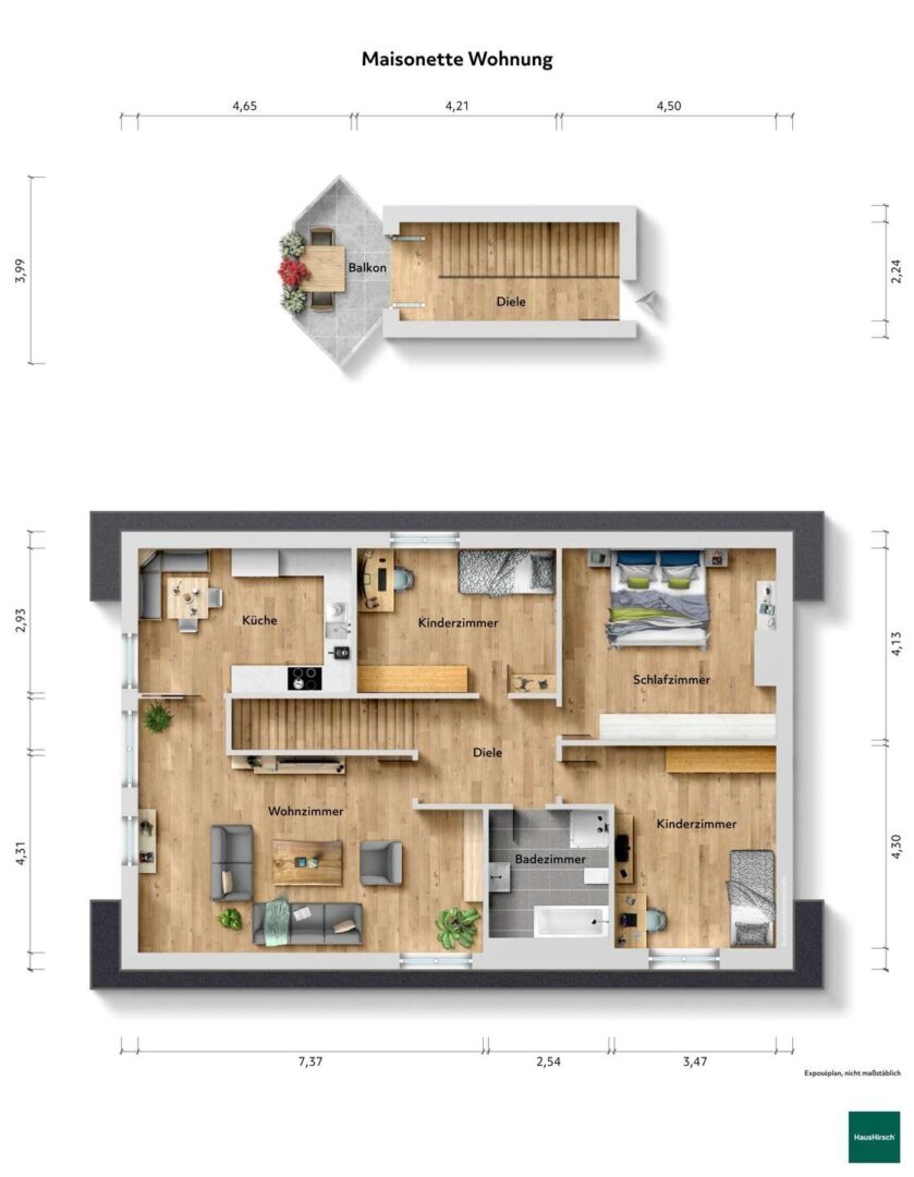 Diese gepflegte 4-Zimmer-Wohnung (3 Schlafzimmer + Wohnzimmer) in einem 5 Parteien Haus, überzeugt mit einem praktischen Grundriss über zwei Ebenen und einer freundlichen Wohnatmosphäre. Der Eingang liegt im 1. Obergeschoss; hier befindet sich auch der Balkon mit elektrischer Markise. Über die interne Treppe gelangt man in den Wohnbereich: Vom zentralen Flur gehen drei Schlafzimmer, das Tageslichtbad sowie das Wohnzimmer ab. Vom Wohnzimmer führt eine Schiebetür in die Küche – die Einbauküche inkl. elektrischer Markengeräten (2021) ist im Kaufpreis enthalten. Das Badezimmer verfügt über eine Badewanne, eine separate Dusche, eine Toilette und ein Waschbecken.