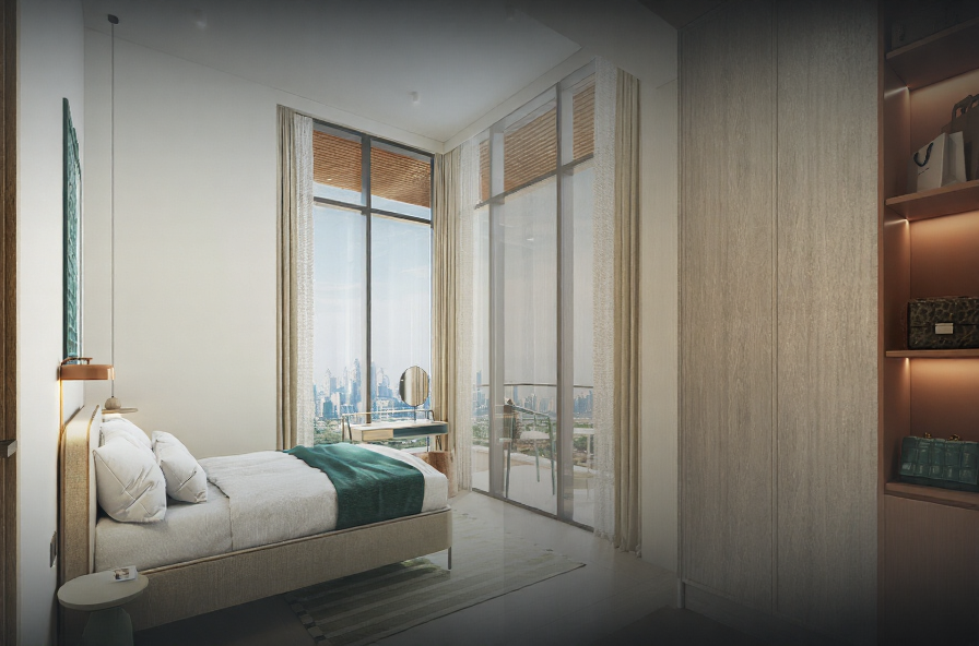 Das Schlafzimmer bietet einen ruhigen Rückzugsort mit einem geräumigen Kleiderschrank und einem großen Fenster, das den Raum mit natürlichem Licht füllt. Stellen Sie sich vor, Sie wachen mit einem atemberaubenden Blick auf die Skyline der Stadt auf oder beobachten den Sonnenuntergang von Ihrem eigenen Bett aus.