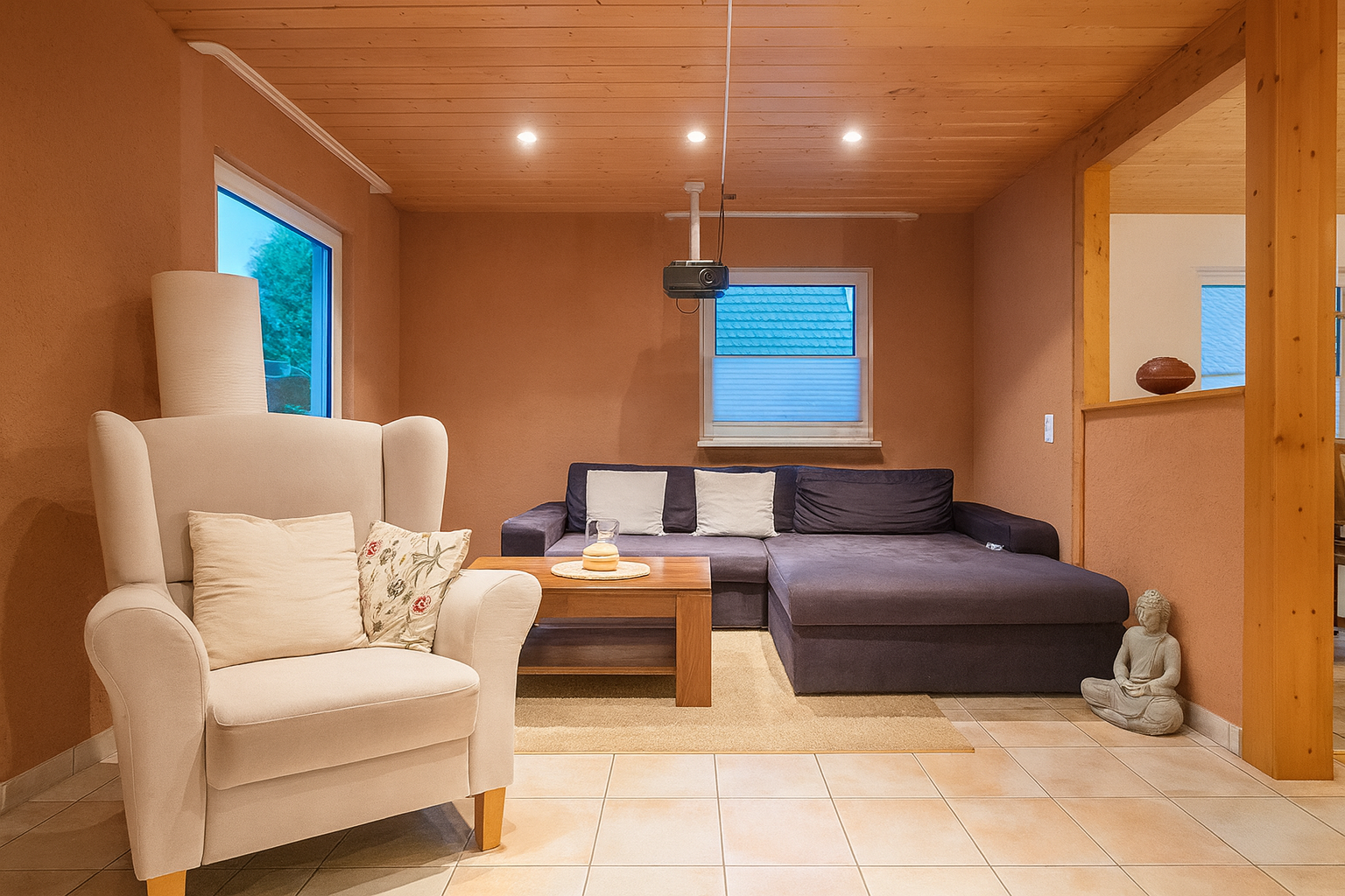 Herzstück des Hauses ist der helle Wohnbereich, der durch einen gemütlichen Kachelofen eine besondere Wohlfühlatmosphäre ausstrahlt – perfekt für entspannte Abende in der kühlen Jahreszeit. Vom Wohnzimmer aus gelangen Sie direkt auf die Terrasse, die an warmen Tagen zum Verweilen im Freien einlädt. Der angrenzende Garten auf einem 676 m² großen Grundstück bietet reichlich Platz zum Spielen, Gärtnern oder einfach zum Genießen der Natur.