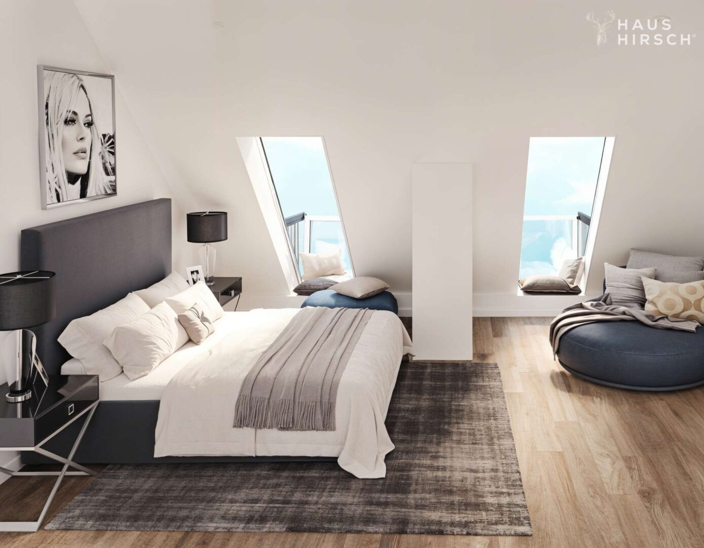 Master-Suite: Gestalten Sie sich hier oben Ihr privates Reich mit Schlafzimmer, Ankleide und direktem Zugang zu dDachbalkonen, die Ihnen einen unverbaubaren Blick – unter anderem auf den markanten Turm der Nachbarschaft – schenken.