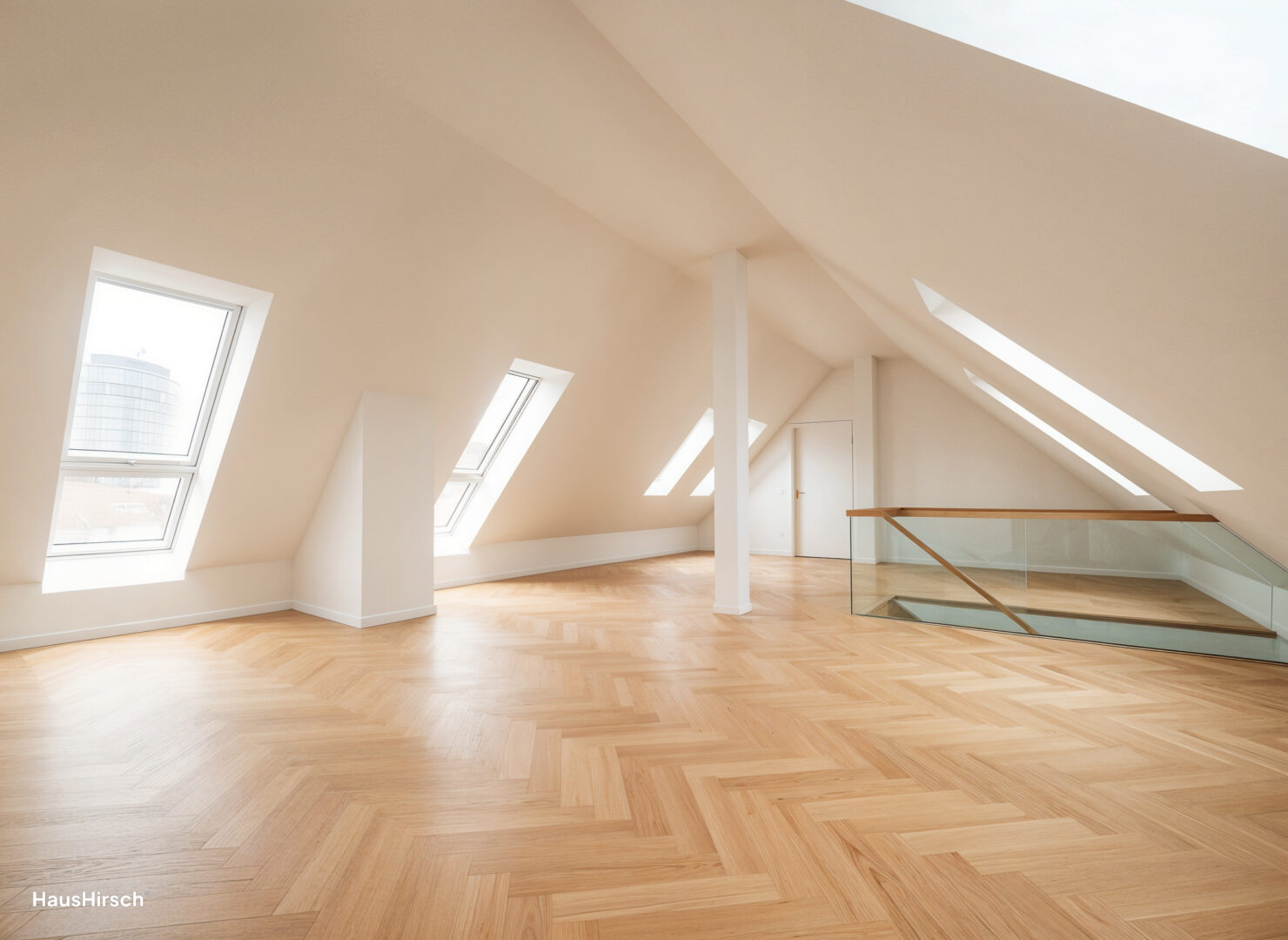 Eine Treppe führt Sie hinauf in den spektakulären Dachspitz. Hier oben herrscht eine ganz eigene Magie aus Ruhe und Weite.