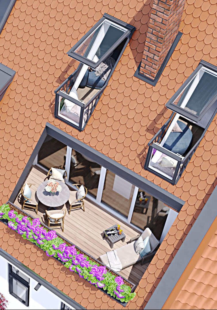 Die Südterrasse: Die angrenzende, großzügige Dachloggia (Dachterrasse) öffnet den Wohnraum nach Süden. Genießen Sie hier Ihren Sundowner mit Blick über die Dächer.
