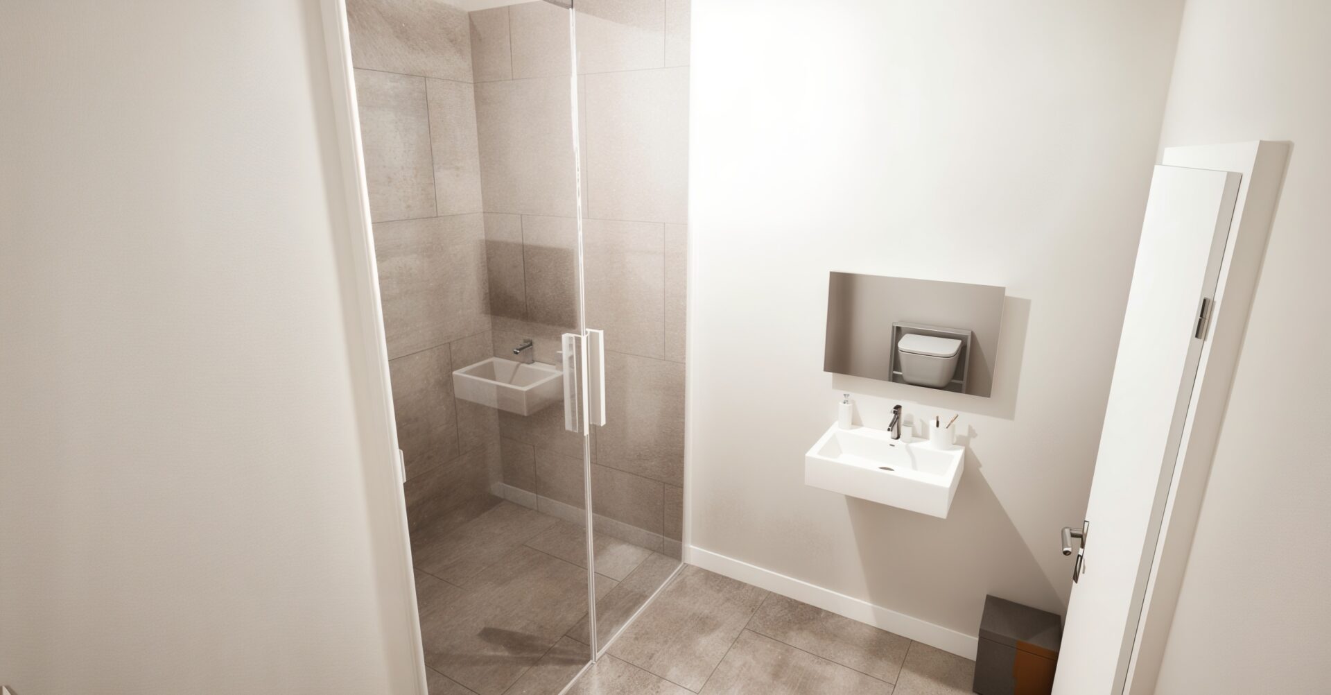 Wellness-Bad: Das geplante Tageslichtbad ist ein Spa-Traum. Vorgesehen sind eine freistehende Badewanne und eine großzügige Walk-in-Dusche – Ihr privater Wellnessbereich unter dem Himmel Münchens.