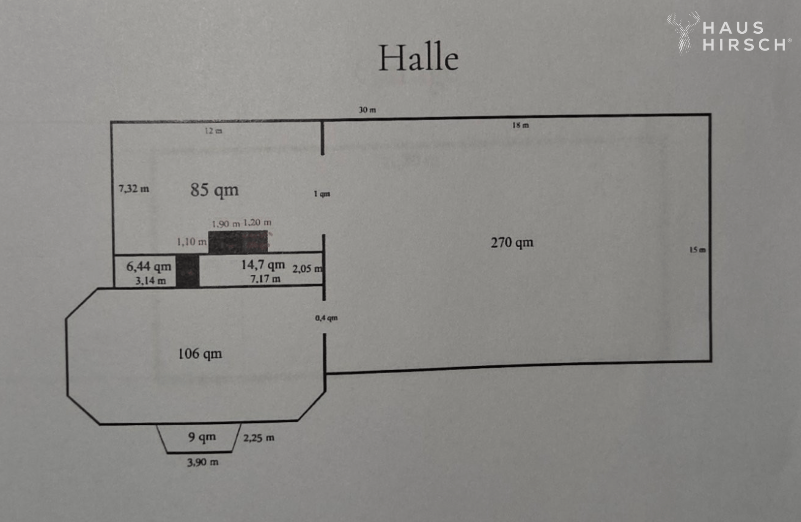 Die beheizbare Gewerbehalle mit 6 m Höhe erfüllt sämtliche Anforderungen an moderne betriebliche Nutzung und ist optimal erschlossen.