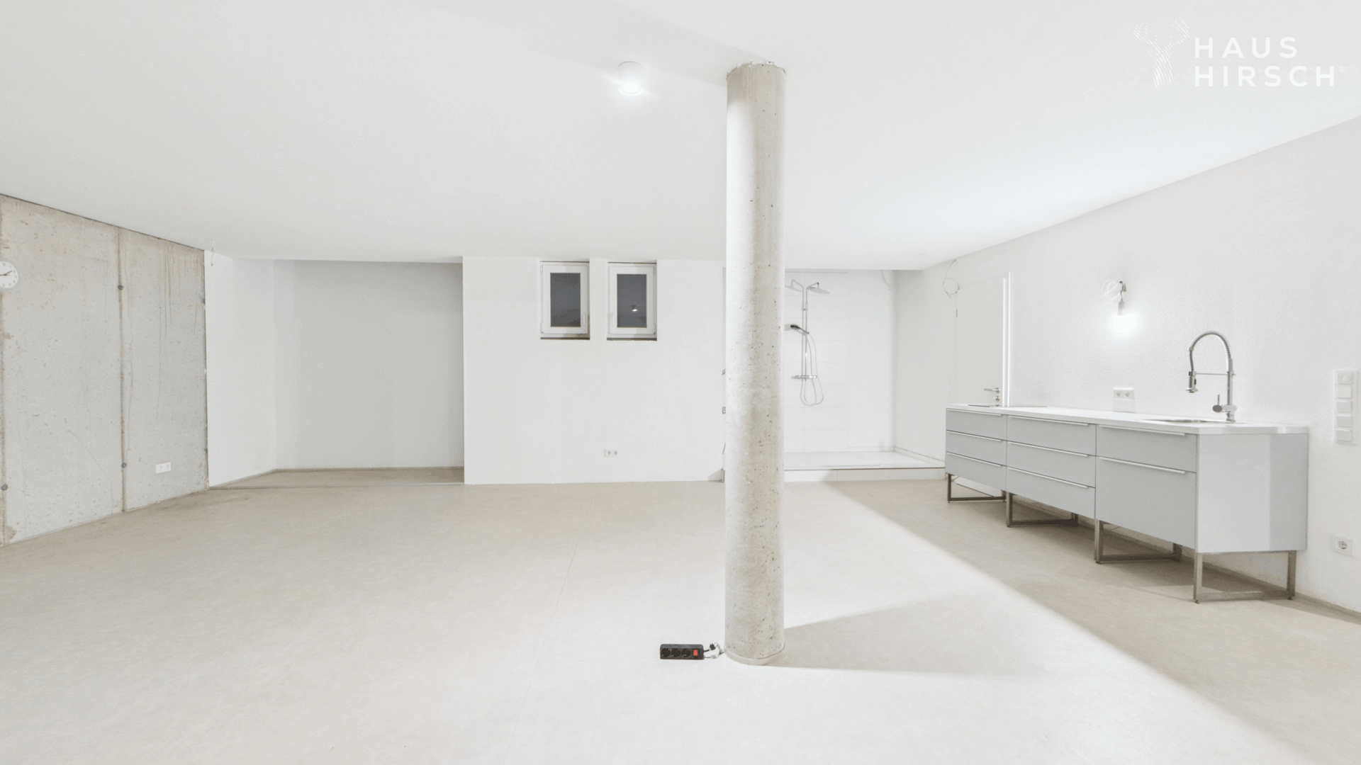 - Ein praktisches Untergeschoss mit Lichtschächten, für viel Tageslicht, mit großer offener rainshower dusche, KüchenZeile. keller mit zusätzlichem Stauraum