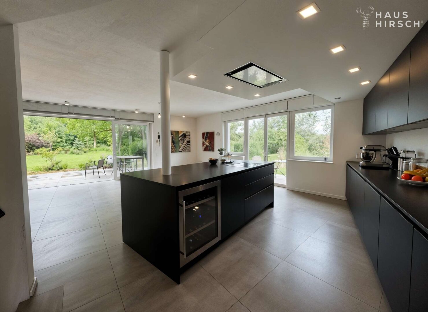 Offene Küche mit Kochinsel und Blick in den Garten