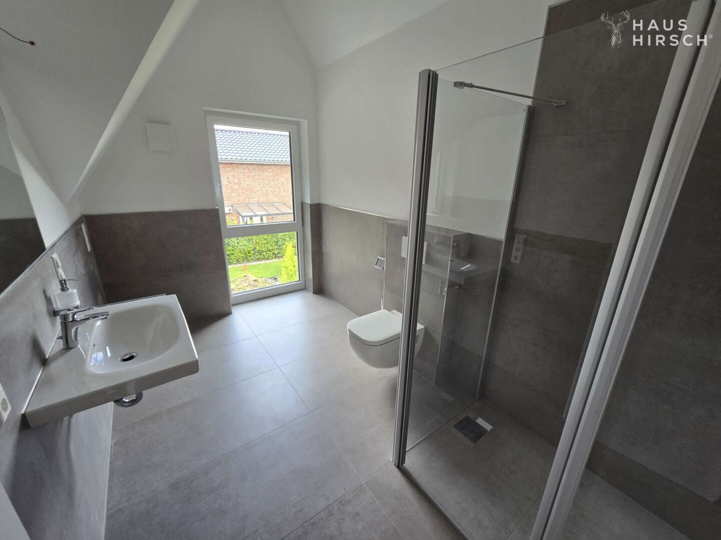 - moderne Badausstattung mit extra großen Feinsteinzeugfliesen, bodengleicher Dusche, Glasabtrennung und Fenster