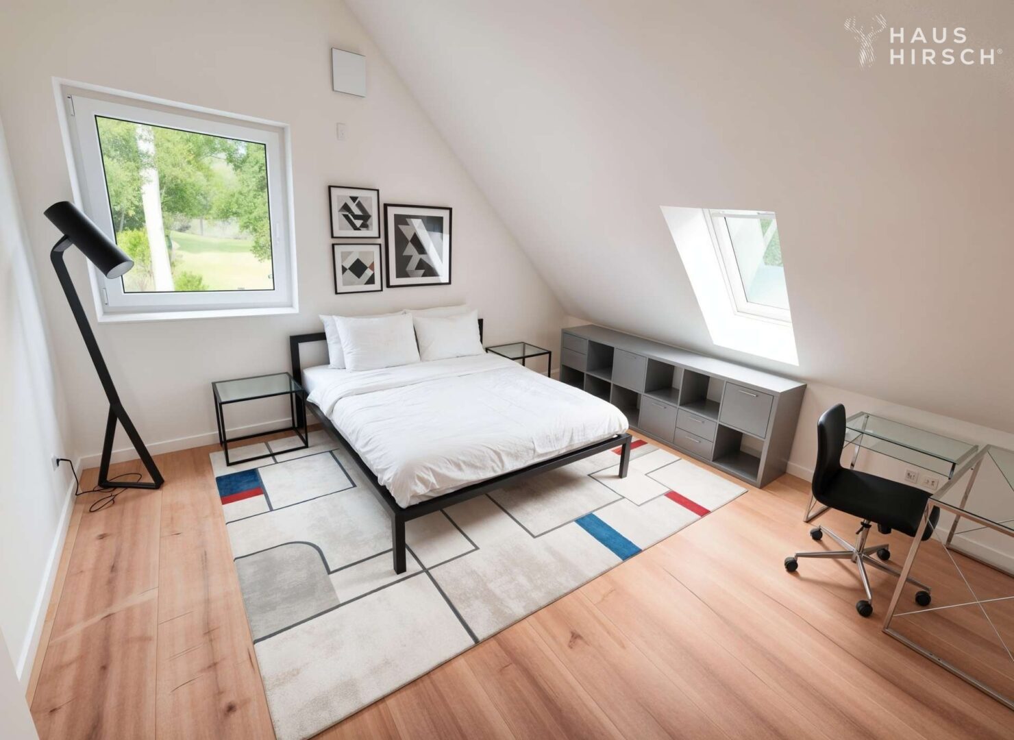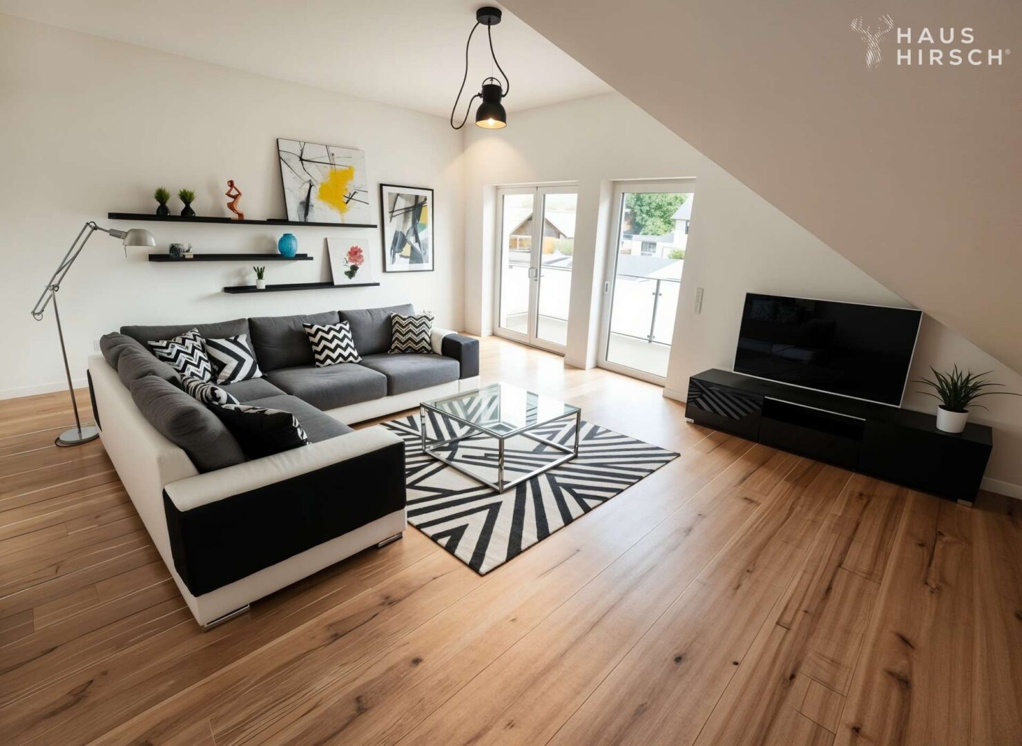Sie betreten Ihr neues 94 m² grosses, schickes Zuhause durch einen ebenerdigen Eingang mit Abstellraum und großem Windfang für Ihre Garderobe - dann gelangen Sie über eine geflieste Treppe mit Edelstahlgeländer in den Flur, von dem man mehrere Räume betreten kann. Ihren Wohnbereich mit Zugang zum Balkon, einen direkt angrenzenden, modernen und offen konzipierten Bereich für eine Küche mit einem großen Abstellraum mit Waschmaschinenanschluss gleich daneben, ein großes, komfortables Bad mit großformatigen Feinsteinzeugfliesen in elegantem Grauton, bodengleicher Dusche mit zusätzlicher Kopfbrause und komfortablem Handtuchheizkörper, ein geräumiges Elternschlafzimmer sowie ein schönes Kinderzimmer. Diese Wohnung verfügt zusätzlich über eine großzügige Ausbaureserve (mit Steckdose und Licht, aber keine Stehhöhe) im gedämmten Dachgeschoss, dass über eine ausziehbare Bodentreppe erreicht werden kann. Wenn Sie möchten, haben Sie hier noch viele gestalterische Möglichkeiten!