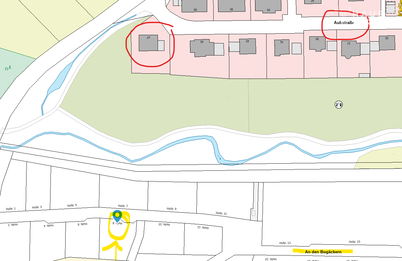 Aufgrund des Neubaugebietes werden die Geodaten der Adresse "An den Bugäckern" nicht korrekt angezeigt. Daher wurde die Aubstraße 47 (Parallelbaugebiet) genommen.