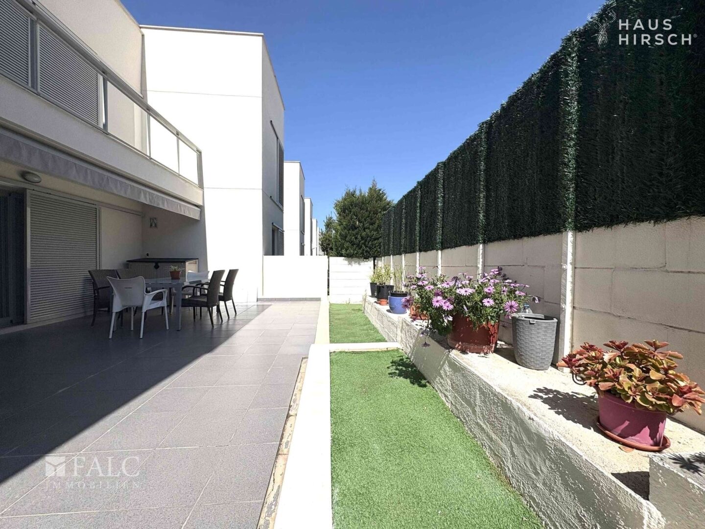 Ein besonderes Highlight sind die mehreren Terrassen, die zum Verweilen im Freien einladen. Hier können Sie die Ruhe genießen oder gesellige Abende mit Freunden und Familie verbringen. Der Blick auf den Pool und den gepflegten Gemeinschaftsgarten ist ein zusätzlicher Pluspunkt.