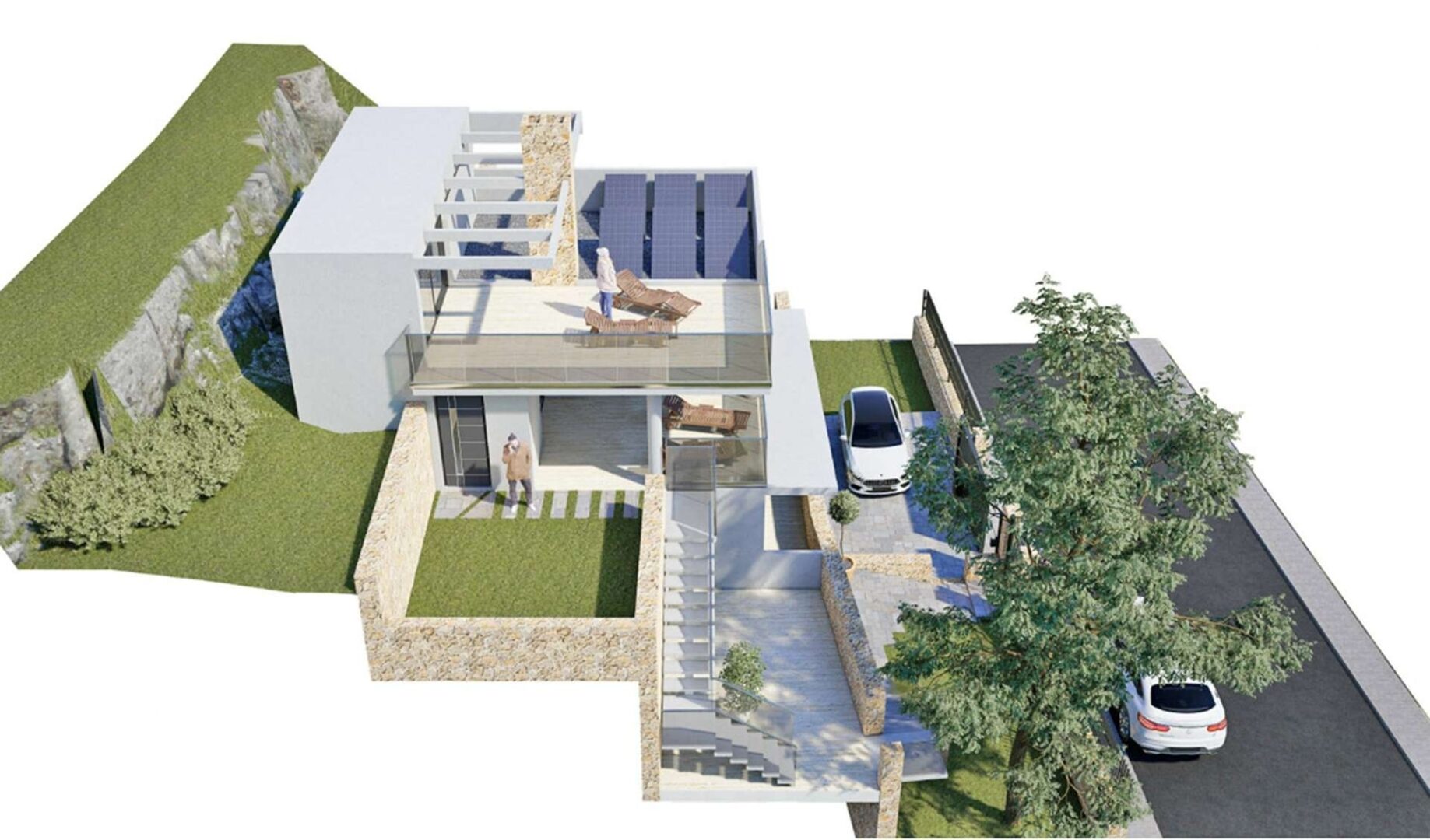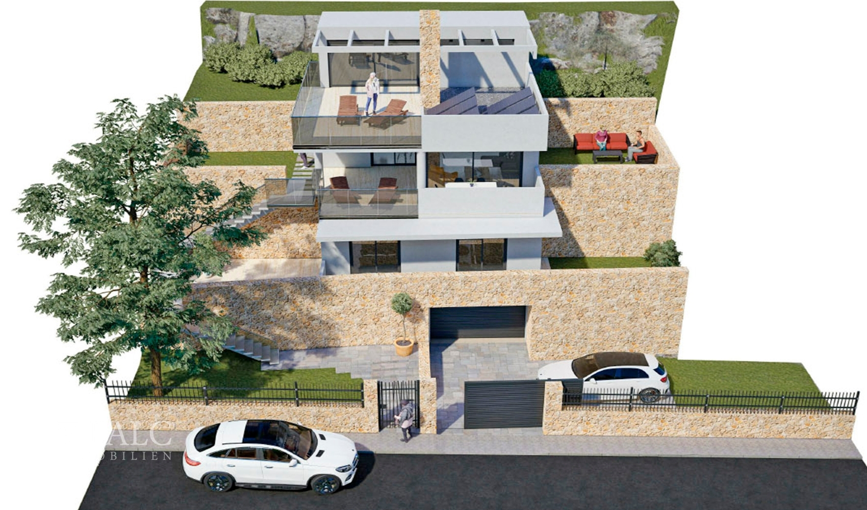 Das Untergeschoss, verbunden über eine Treppe oder optional einen Aufzug, bietet nicht nur ausreichend Parkmöglichkeiten, sondern auch Platz für ein Homeoffice oder kreative Räume. Ein pflegeleichter Garten, die Option auf einen Pool und zwei Außenstellplätze runden dieses Angebot perfekt ab.