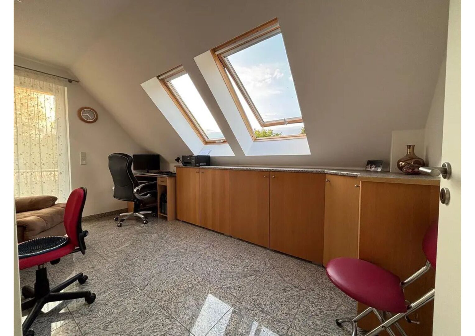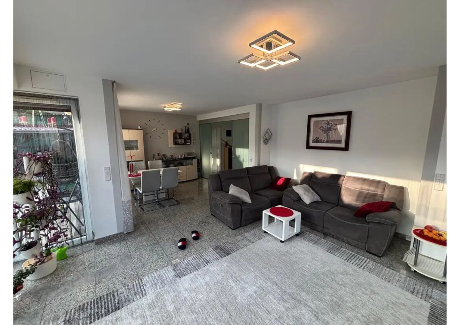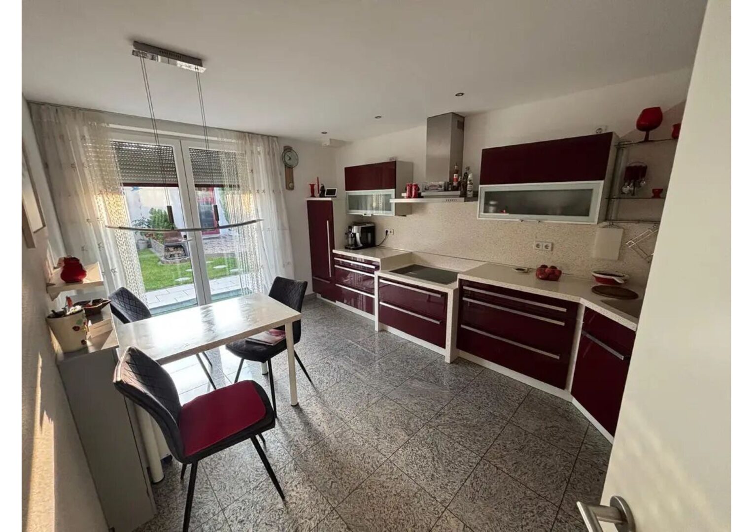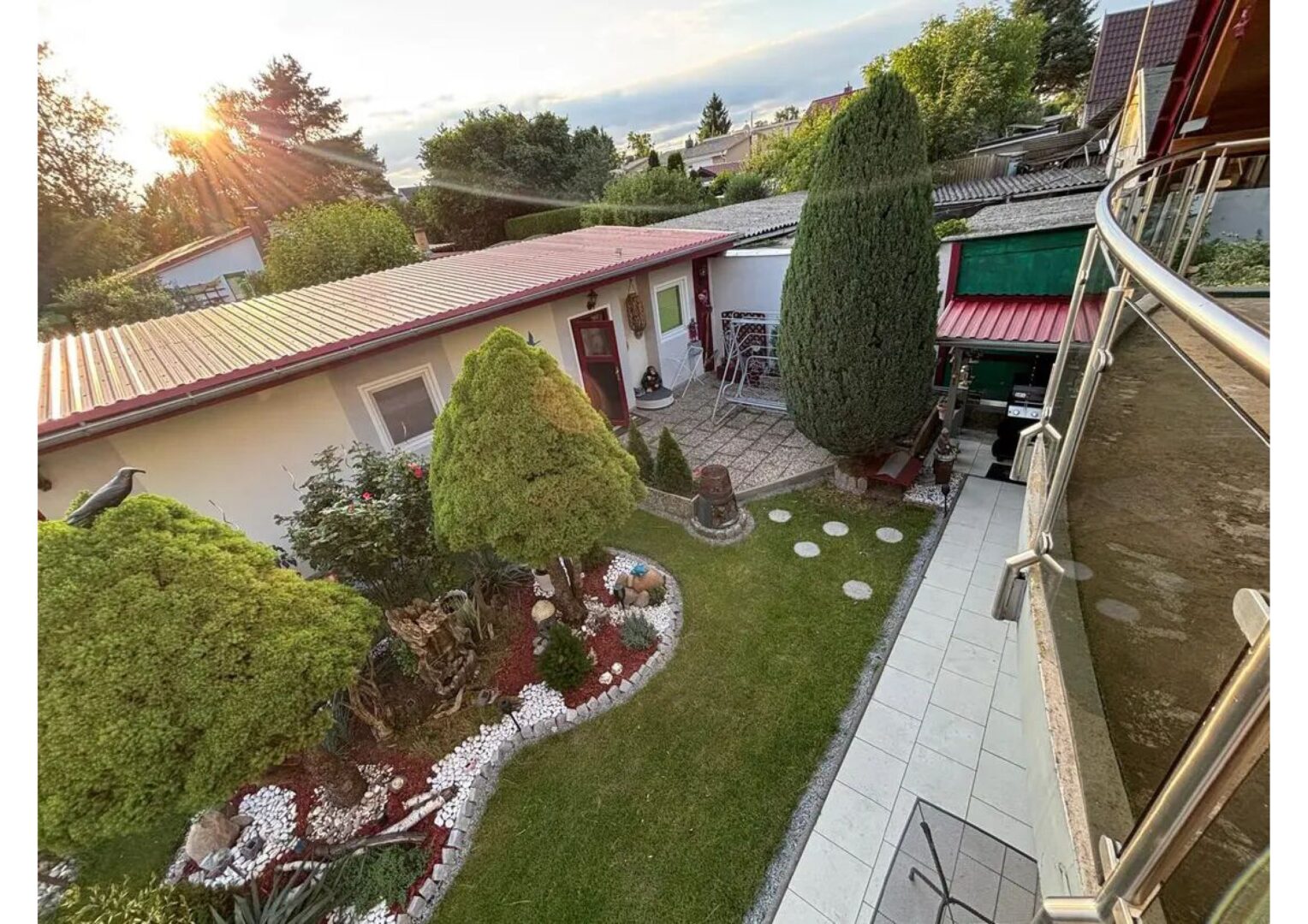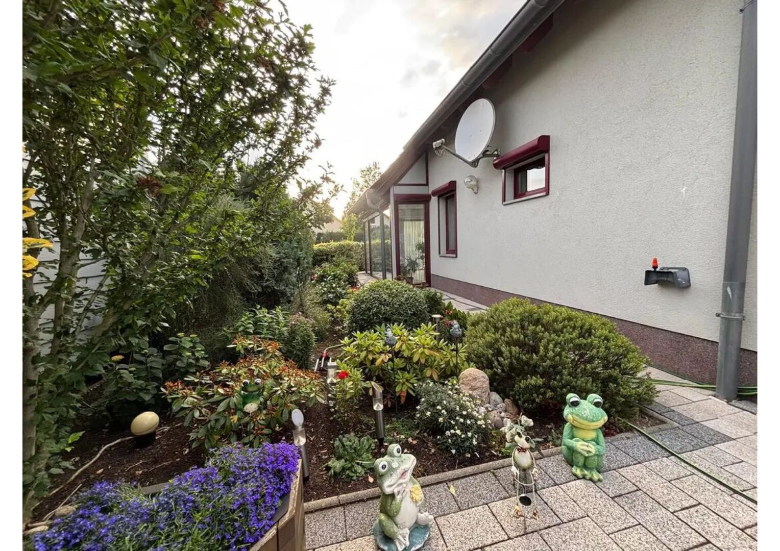 Der sonnige Garten ist eine private Oase der Ruhe, ideal zum Entspannen, Spielen oder Gärtnern. Ein überdachter Balkon bietet einen geschützten Rückzugsort mit Blick ins Grüne.