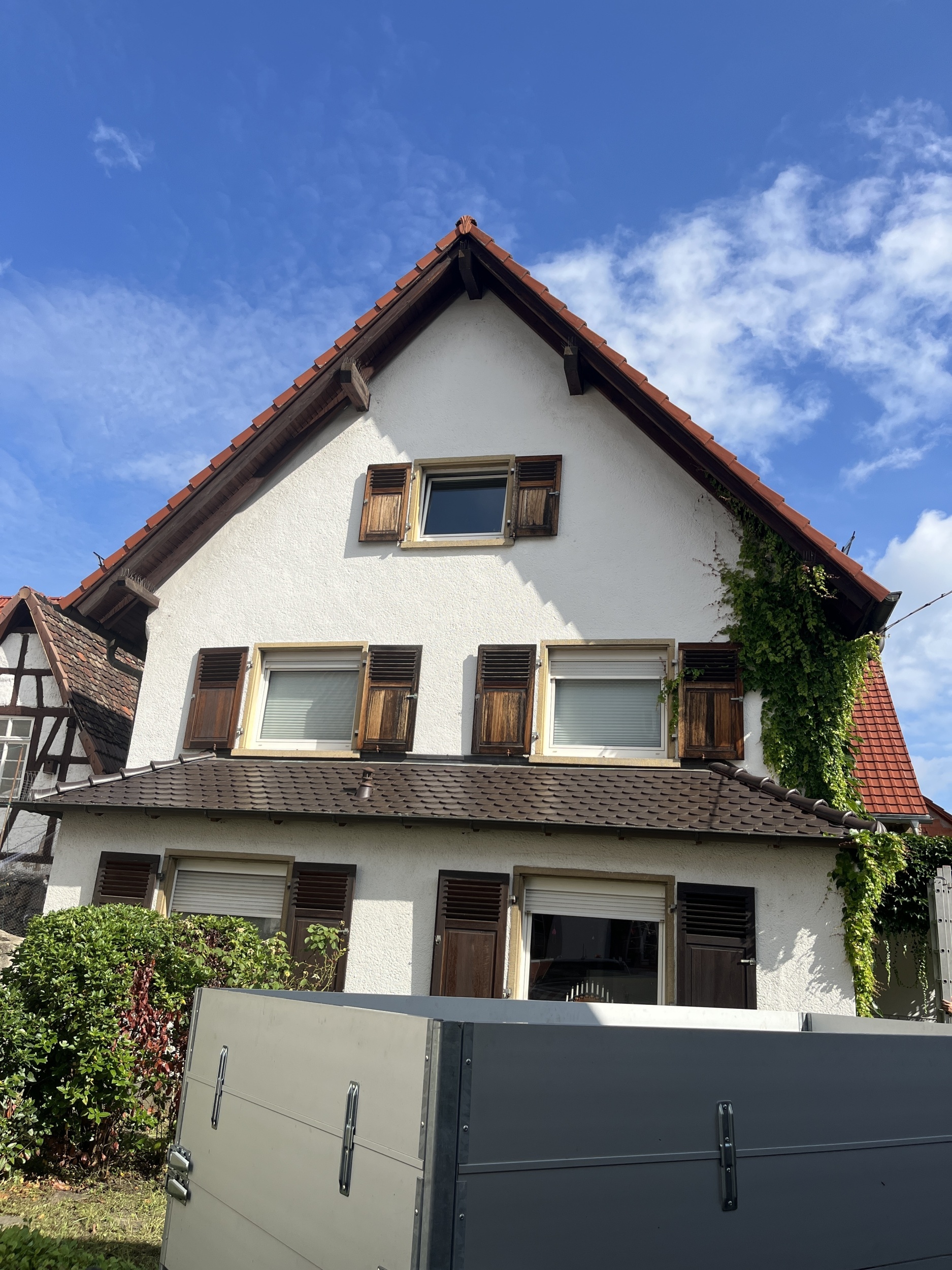 Dreifamilienhaus mit Ausbaupotenzial: Das Haupthaus bietet acht Zimmer, drei Badezimmer, ein Gäste-WC sowie ein ausgebautes Dachgeschoss mit Gauben, was zusätzlichen Wohnkomfort schafft.