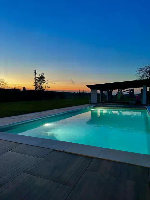 Der Garten umfasst neben dem Salzwasser Pool eine überdachte, tiefergelegene Outdoor-Küche .