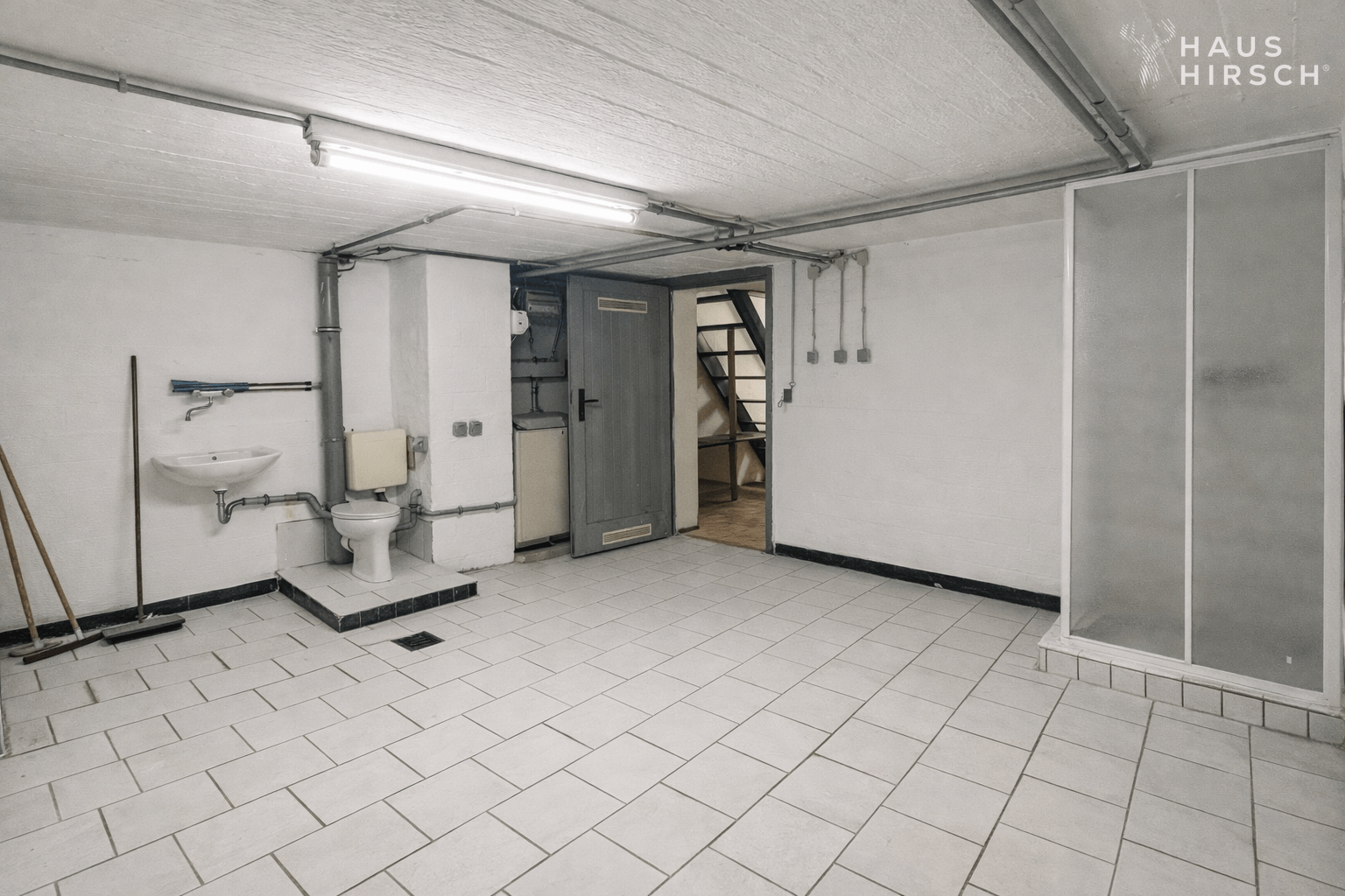 Die großzügigen Kellerräume sind mit einer Dusche, einem WC und einem Waschbecken ausgestattet, was sie vielseitig nutzbar macht - sei es als Hauswirtschaftsraum, Hobbyraum oder Lagerfläche.