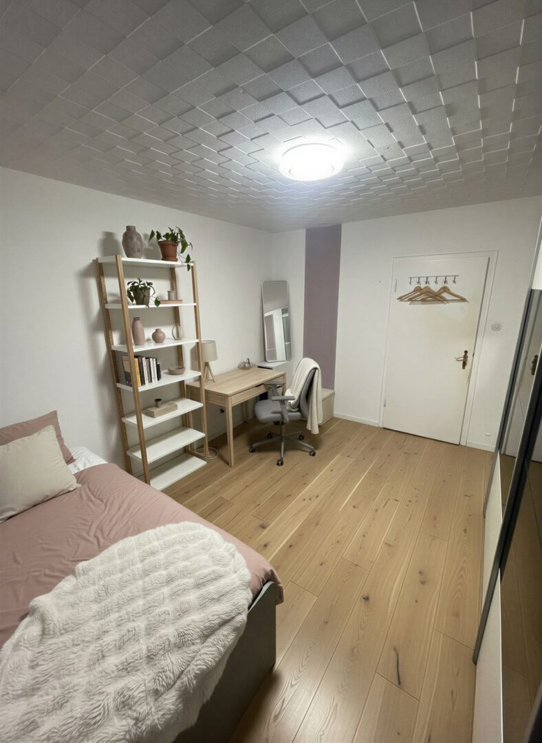 Das Schlafzimmer ist ruhig gelegen und bietet genügend Stauraum für Kleidung und persönliche Gegenstände. Ein weiteres Zimmer kann ideal als Kinderzimmer, Arbeitszimmer oder Gästezimmer genutzt werden. Das Badezimmer verfügt über eine Badewanne und ein separates WC.