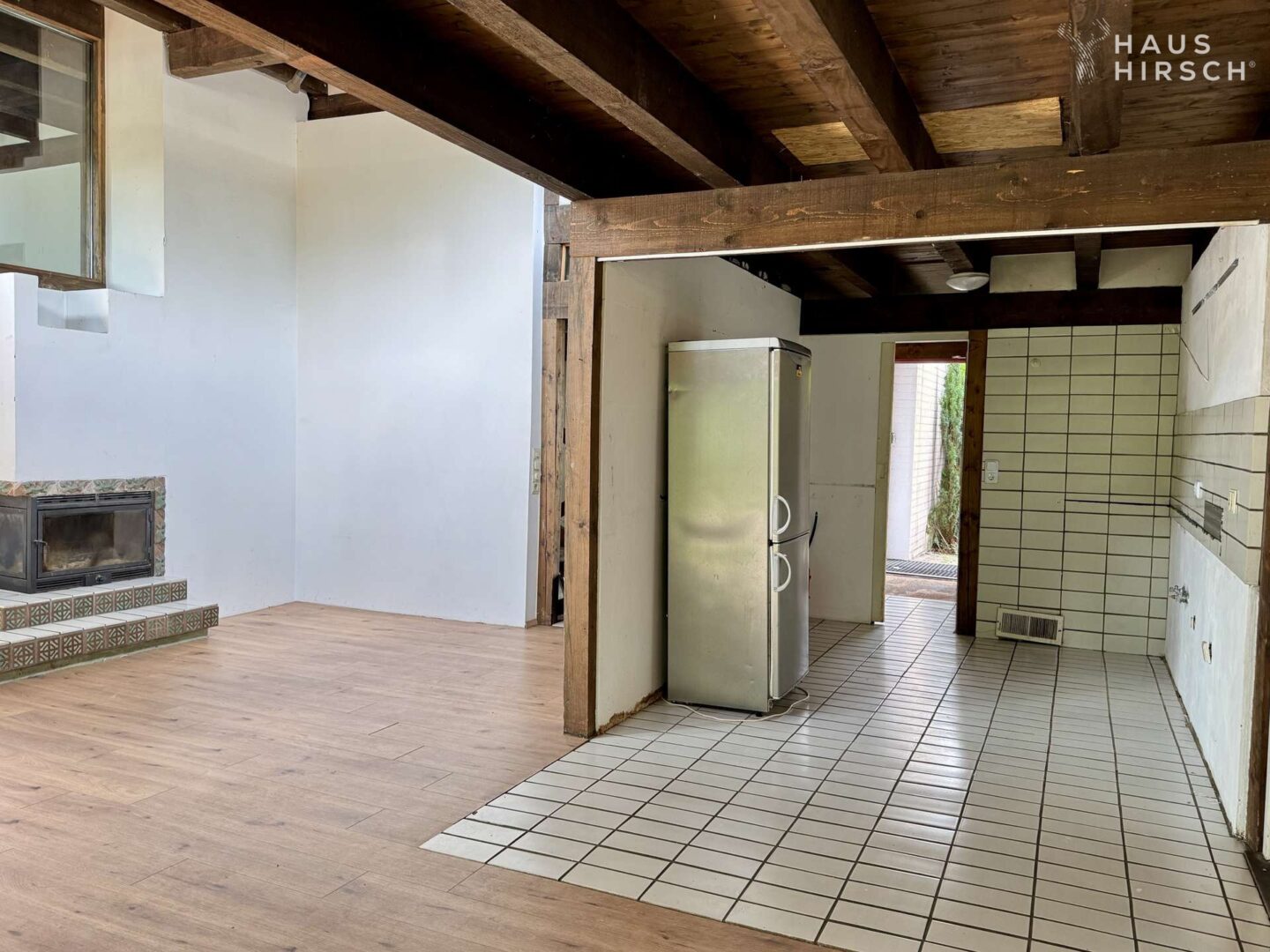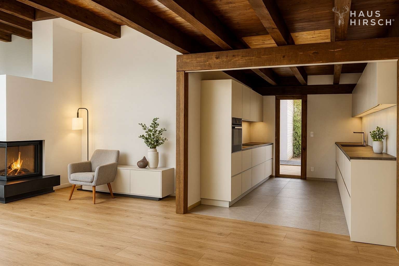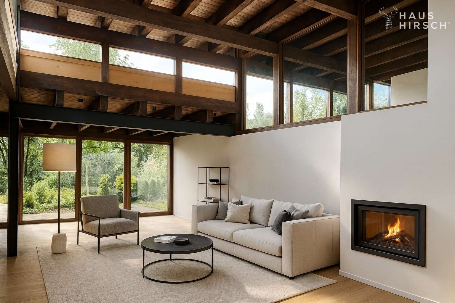 Ein echtes Highlight ist der Kamin im Wohnbereich, der dem Haus trotz aller architektonischen Klarheit eine warme, wohnliche Atmosphäre verleiht. Große Fensterflächen öffnen den Blick ins Grüne und holen den Garten direkt in den Wohnraum.