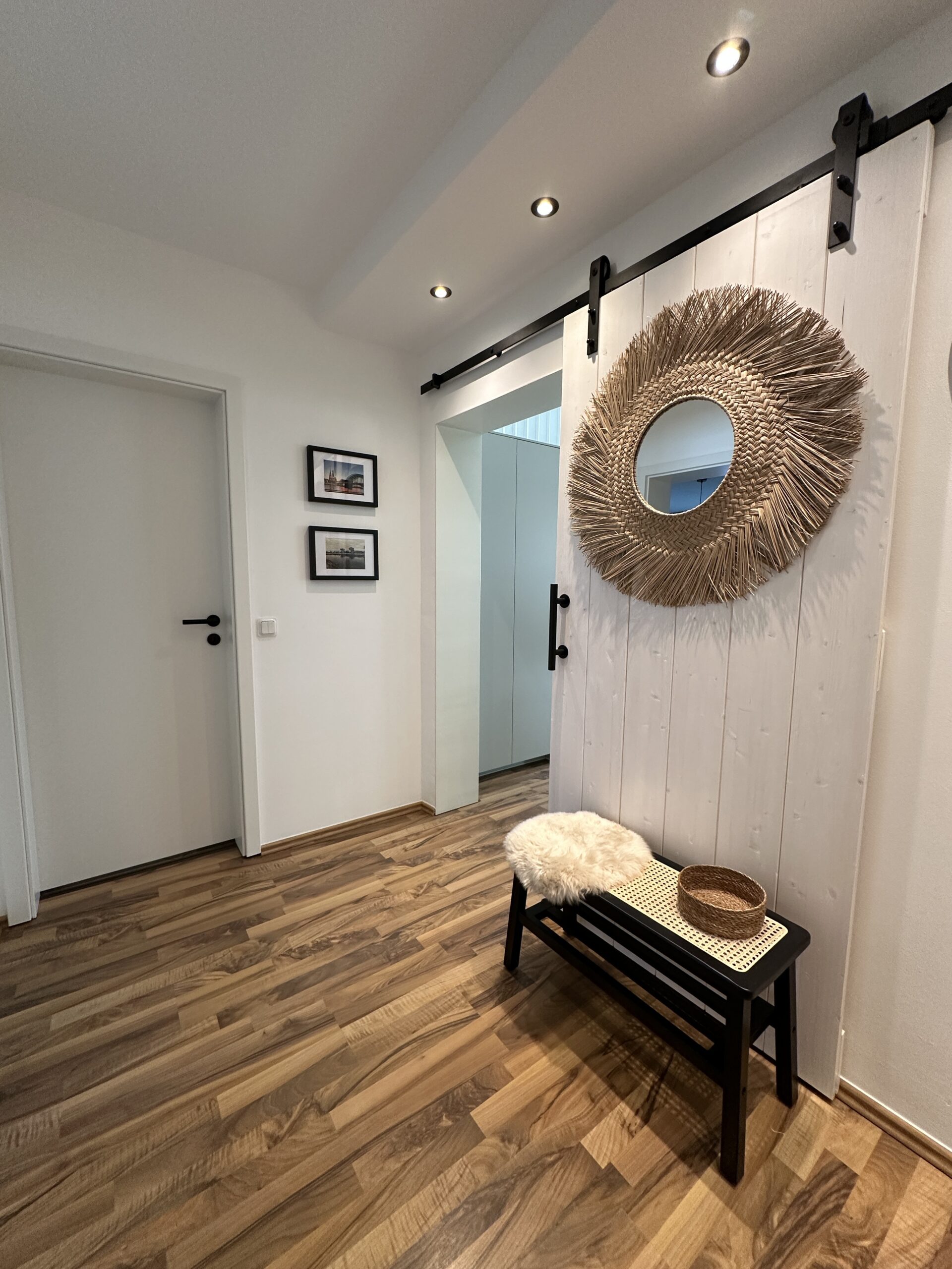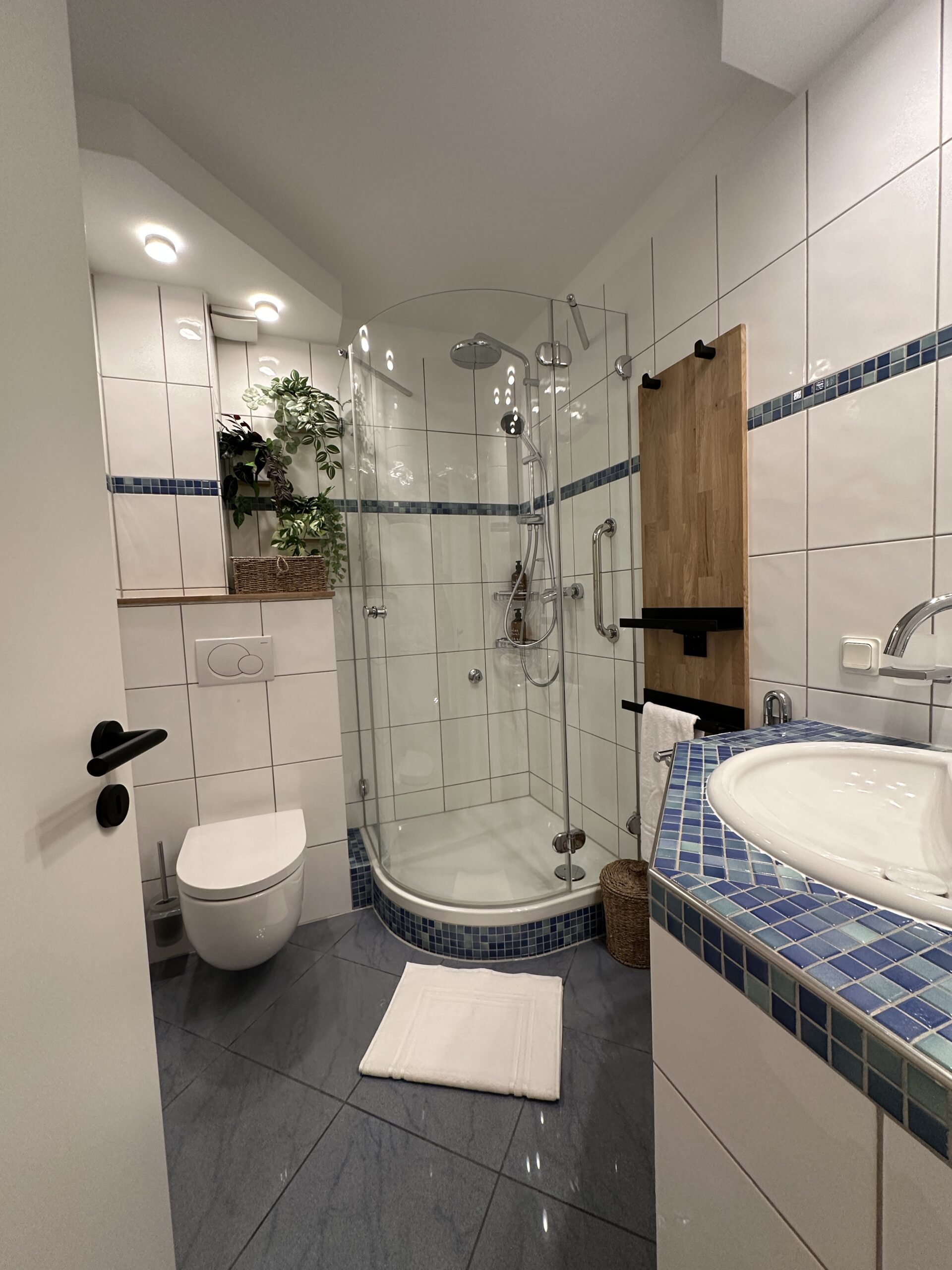 Geradeaus öffnet sich vom Flur aus das modern gestaltete Badezimmer, das im Zuge der Renovierung 2025 ebenfalls erneuert wurde und einen frischen, zeitgemäßen Eindruck hinterlässt.