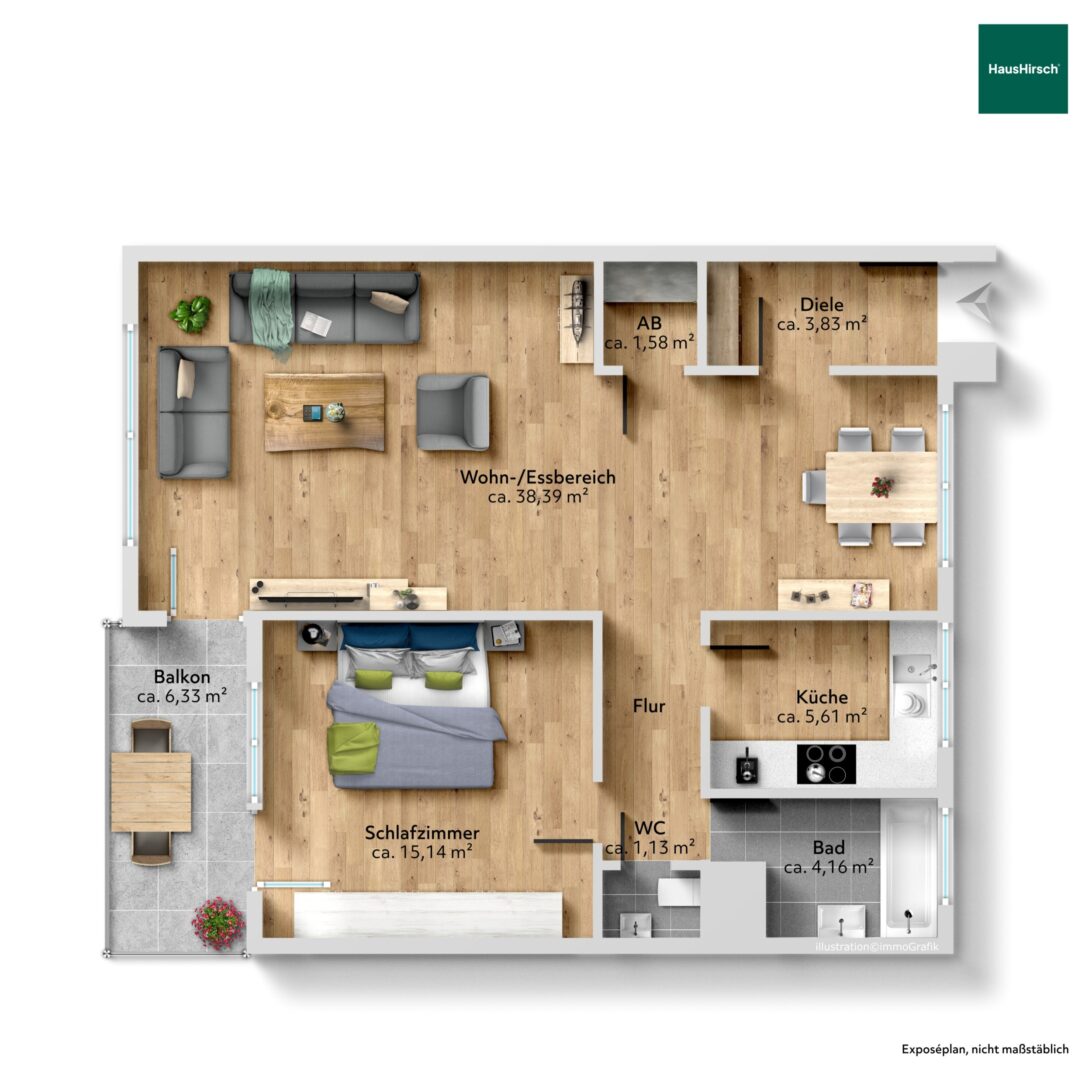 • 1 großzügiger Wohn- und Essbereich mit Zugang zum Balkon