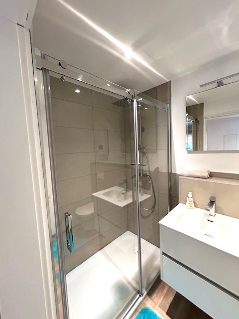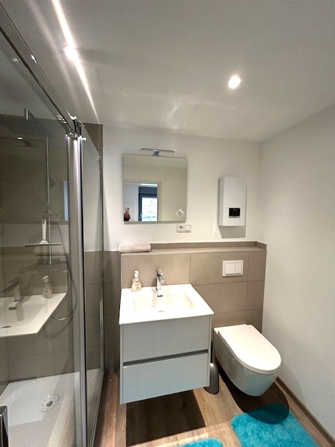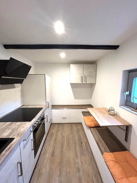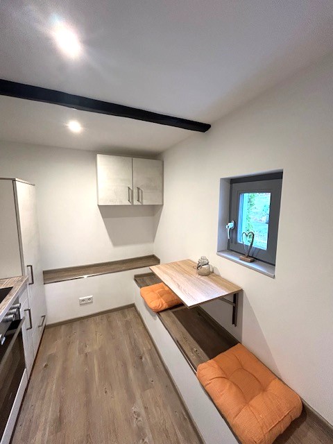 Der Wohnbereich ist funktional und gemütlich gestaltet und bietet ausreichend Platz für Wohnen und Entspannen. Die Küche ist mit einer Einbauküche ausgestattet und fügt sich harmonisch in das Wohnkonzept ein. Ein separates Schlafzimmer dient als ruhiger Rückzugsort. Das innenliegende Badezimmer überzeugt mit moderner Ausstattung und einer bodentiefen Dusche, die Komfort und zeitgemäßen Stil vereint.