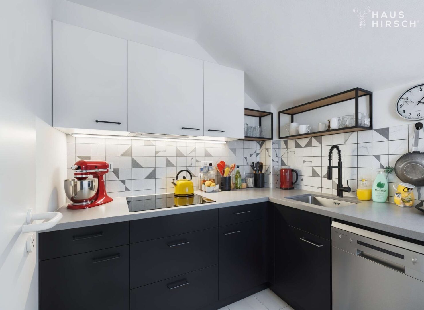 Die Küche ist mit einer praktischen Einbauküche ausgestattet, die alle benötigten Geräte und ausreichend Stauraum bietet. Ein geräumiger Abstellraum steht zur Verfügung, um Ordnung zu halten und zusätzlichen Stauraum zu schaffen.