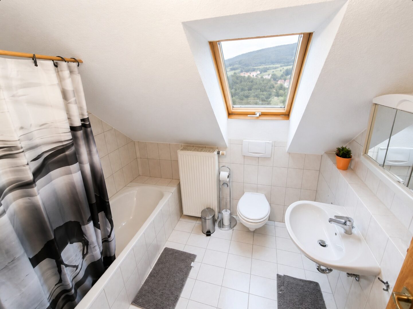 Das Badezimmer ist mit Badewanne und Dachfenster ausgestattet, zusätzlich steht ein separates Gäste-WC zur Verfügung. Hochwertige Parkettböden sorgen für eine warme Wohnatmosphäre.