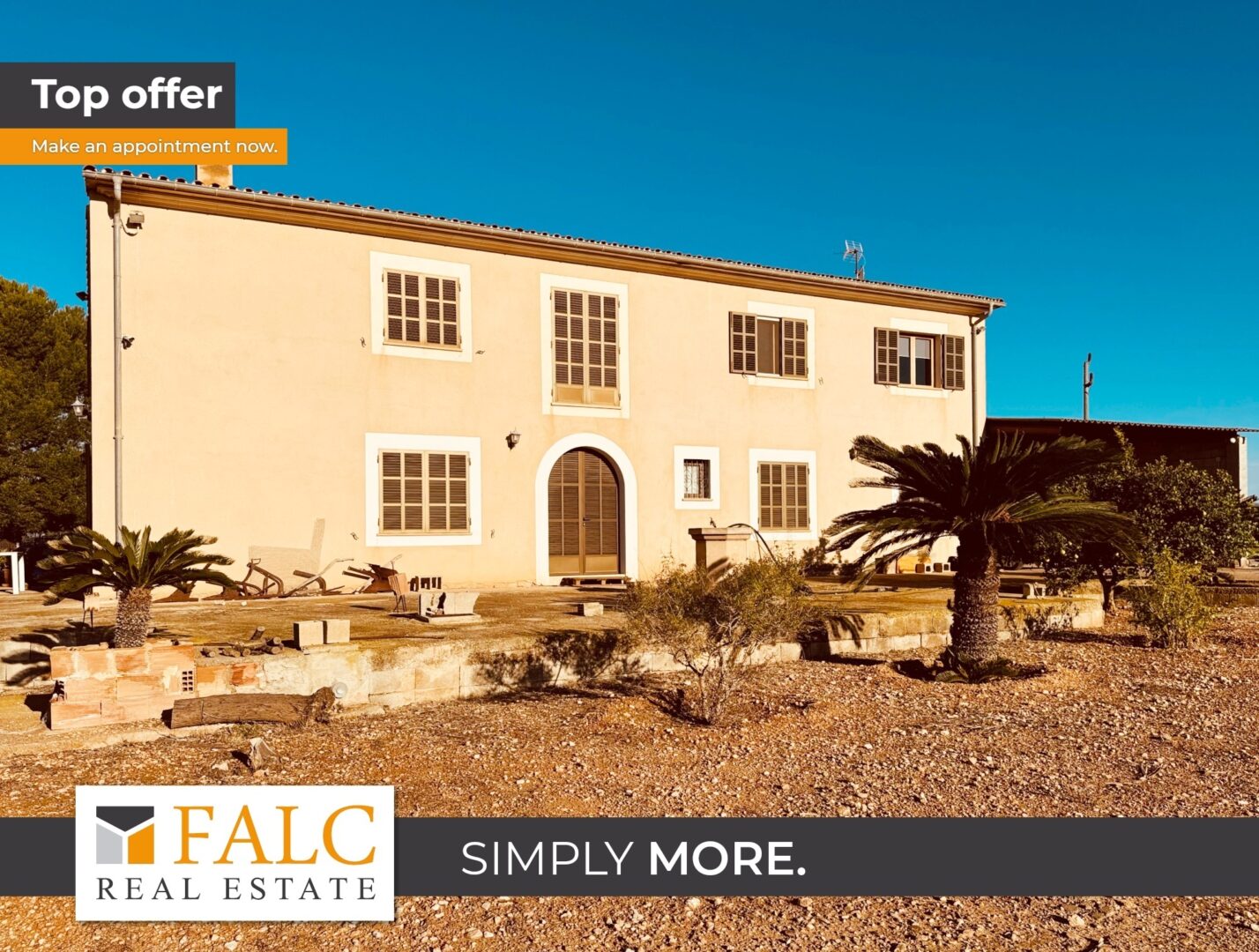 Diese charmante Finca befindet sich inmitten der Natur in der ruhigen und idyllischen Gegend von Campos. Das Haus erstreckt sich über zwei Etagen und bietet auf insgesamt 344 m² Wohnfläche ausreichend Platz für eine Familie und Gäste.