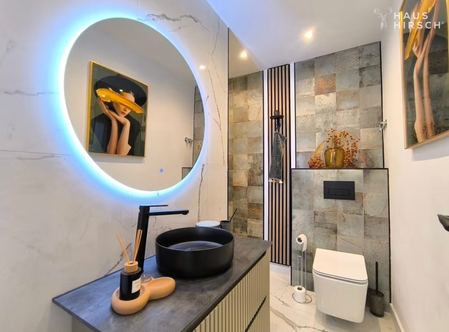 Die Badezimmer sind im einzigartigen mediterranen Stil dekoriert und versprühen ein besonderes Flair. Die professionelle Inneneinrichtung rundet das Gesamtbild ab und lässt keine Wünsche offen.