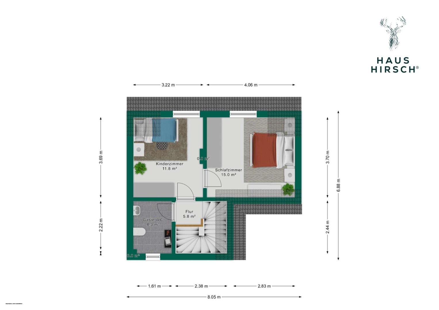 Im Erdgeschoss befinden sich Diele, Küche, Esszimmer, Wohnzimmer sowie ein Dusch-/Wannenbad. Über eine Holztreppe gelangt man ins Obergeschoss mit zwei Schlafzimmern und einer separaten Toilette mit Fenster. Der alte Holzdielenboden im Obergeschoss verleiht dem Haus einen besonderen Charme.