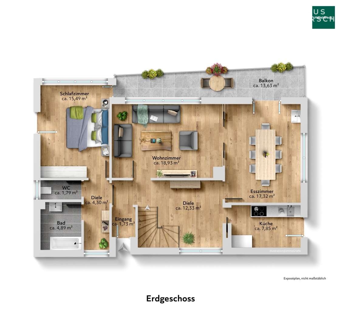 Das Erdgeschoss bildet den zentralen Wohnbereich des Hauses. Bereits beim Betreten vermittelt die Diele eine klare und funktionale Aufteilung. Der helle Wohnbereich mit direktem Zugang zum Balkon bildet den Mittelpunkt dieser Ebene. Das angrenzende Esszimmer schafft eine harmonische Verbindung zwischen Wohnen und geselligem Beisammensein. Die separate Küche bietet ausreichend Platz für individuelle Gestaltungsmöglichkeiten. Ergänzt wird das Erdgeschoss durch ein Schlafzimmer, ein Badezimmer sowie ein zusätzliches separates WC.