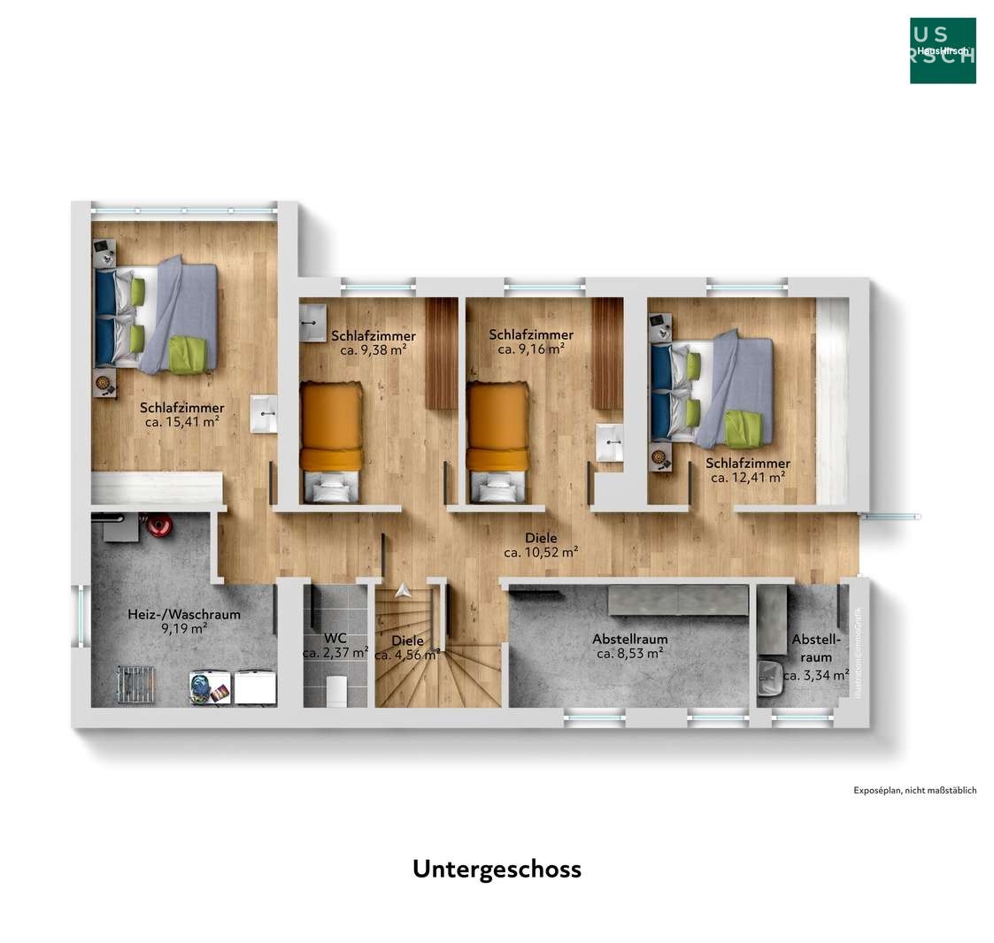 Im Untergeschoss eröffnet sich ein besonders großzügiges Raumangebot: Hier befinden sich vier Schlafzimmer, die flexibel genutzt werden können. Ein Mehrzweckraum mit integrierter Heizungsanlage bietet zusätzliche Nutzfläche. Darüber hinaus stehen ein Abstellraum (optional auch als Hobbyraum nutzbar), ein Hauswirtschaftsraum mit Waschbecken sowie ein separates WC zur Verfügung.