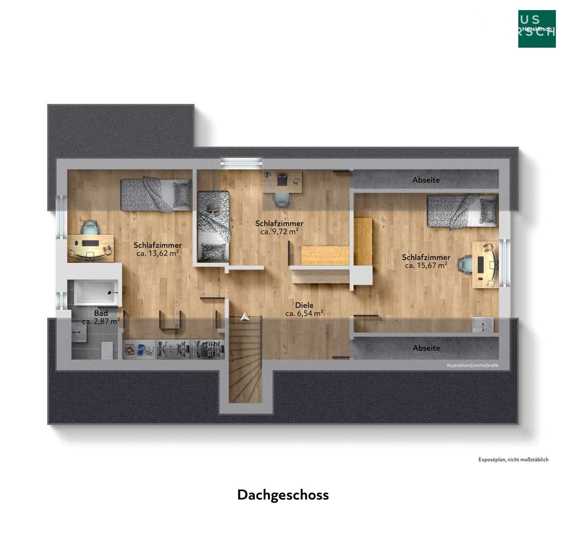 Das Dachgeschoss verfügt über drei gut geschnittene Schlafzimmer und ein weiteres Badezimmer. Die Räume bieten flexible Nutzungsmöglichkeiten und unterstreichen die durchdachte Raumaufteilung.