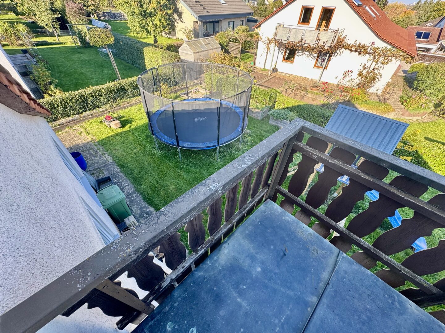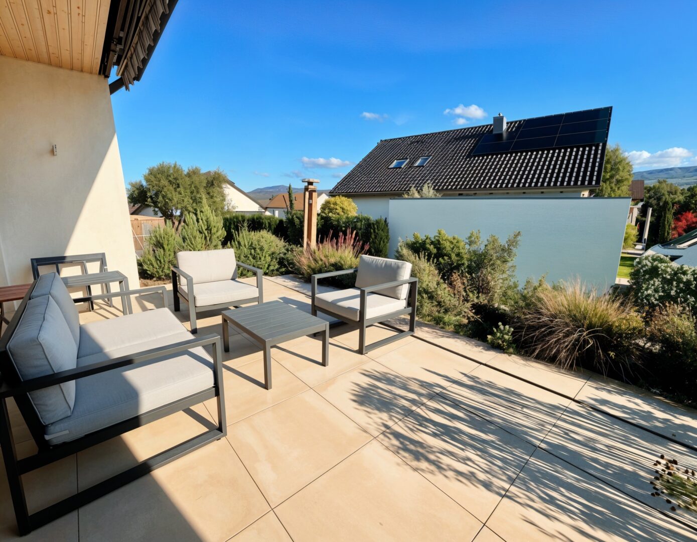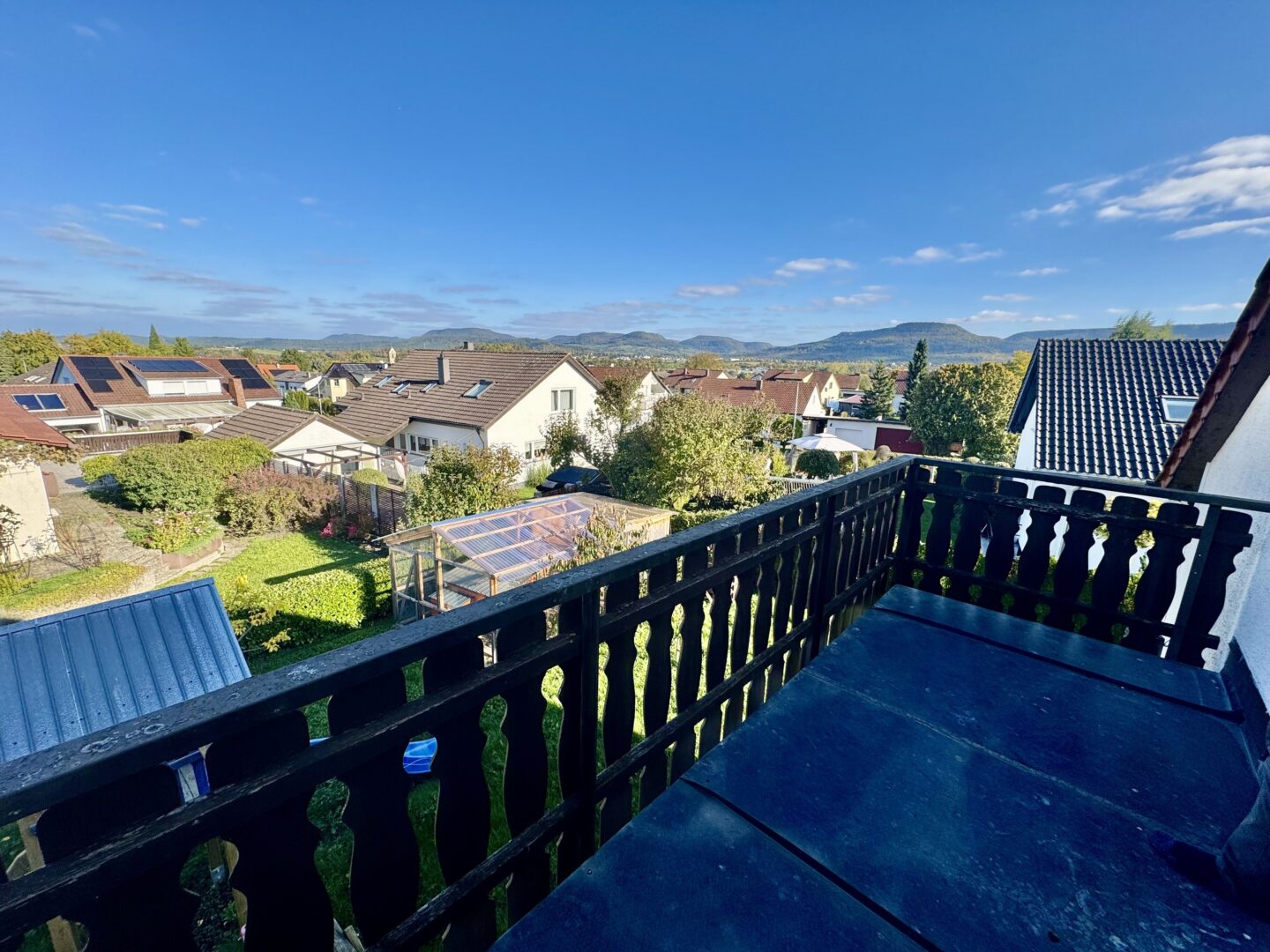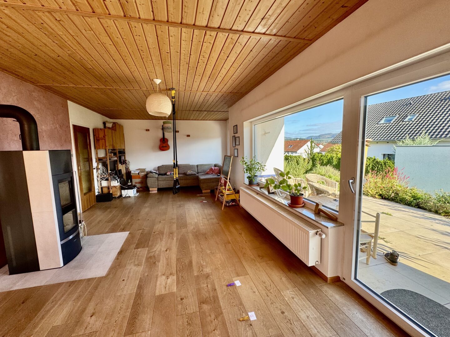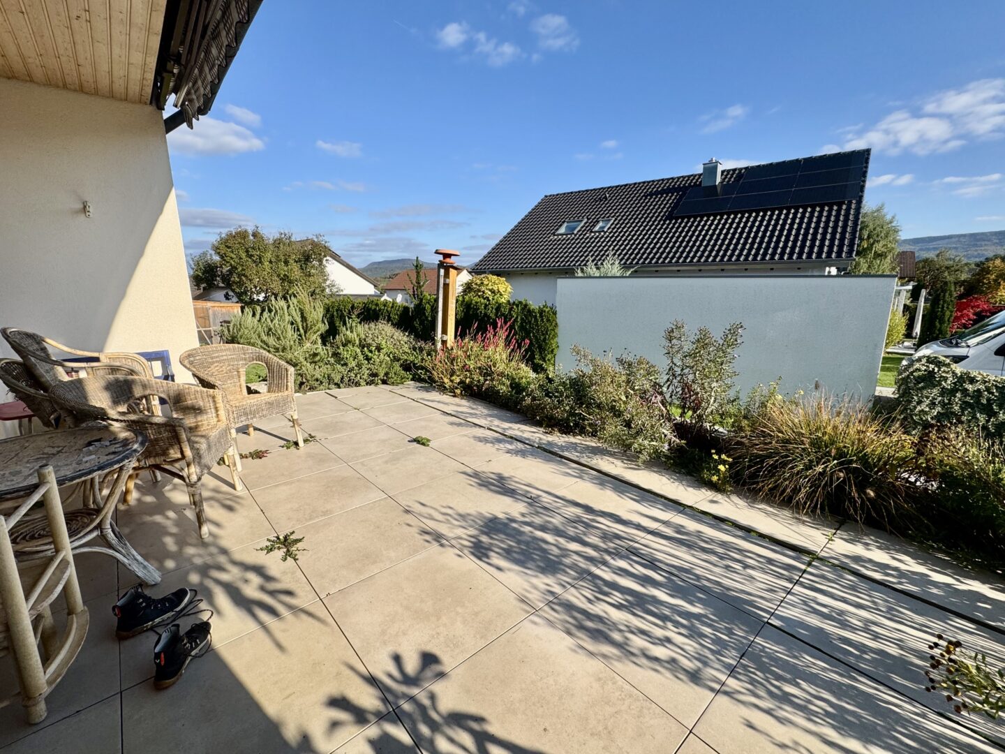 Vom Wohn-Essbereich gelangen Sie auf die gemütliche Sonnenterrasse mit Blick auf die Alb. Die Stufen führen Sie hinunter in den großzügigen Garten, der das Haus umschließt und vielfältige Möglichkeiten für Outdoor-Aktivitäten bietet.