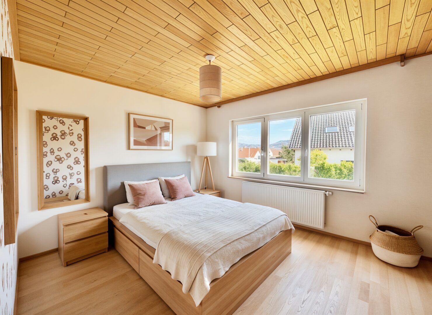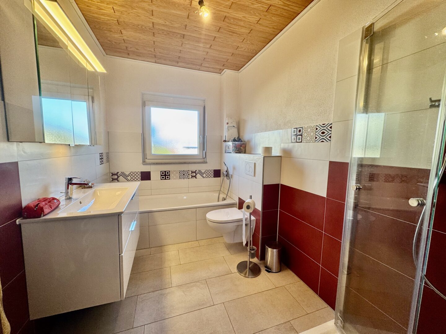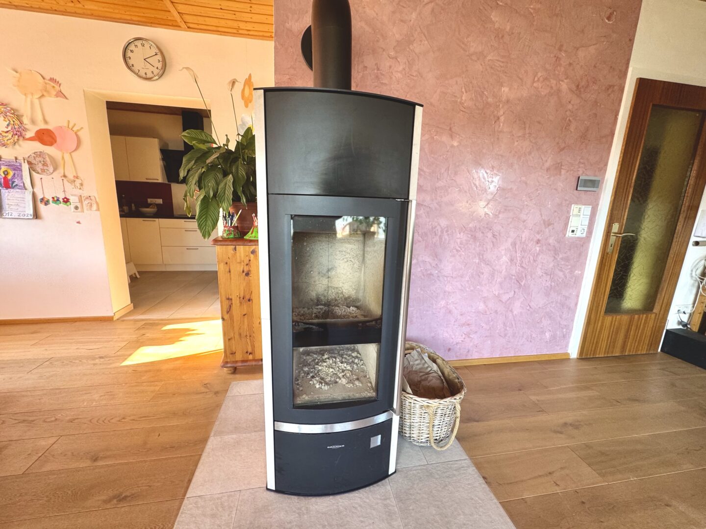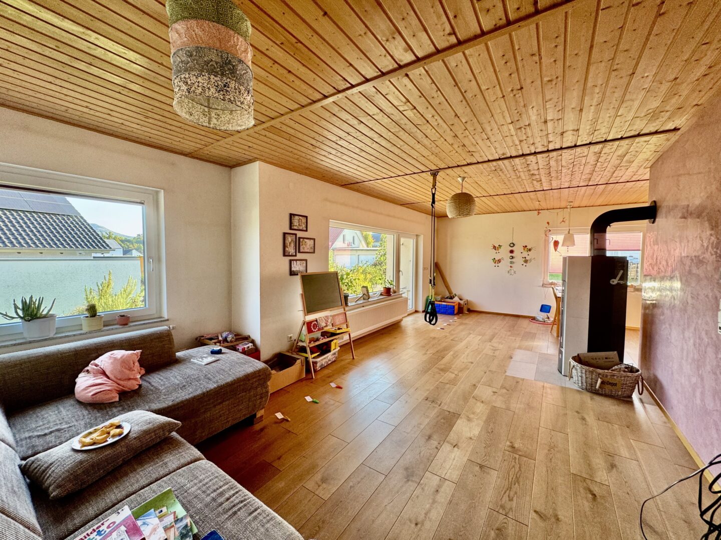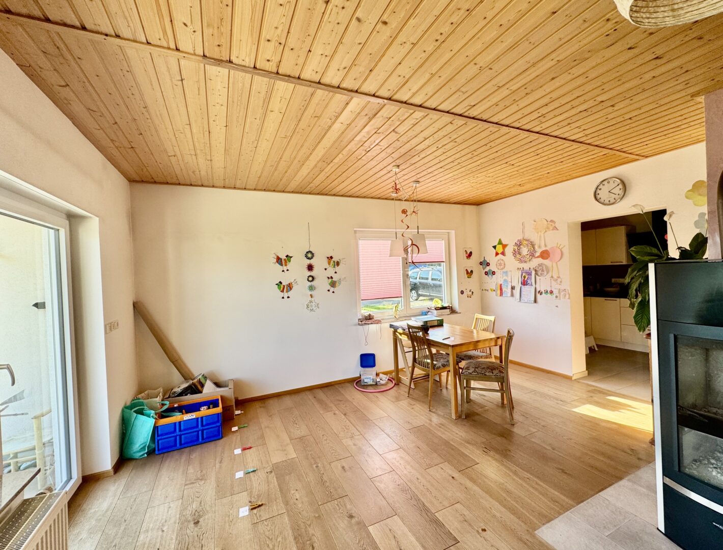Der lichtdurchflutete Wohn-Essbereich mit einem wassergeführten Kaminofen lädt zum Verweilen ein und bildet den Mittelpunkt des Erdgeschosses. Die offene Küche mit einer geräumigen Einbauküche bietet genügend Platz zum Kochen und Genießen. Hier finden Sie auch ein separates Gäste-WC, drei weitere Zimmer und ein Badezimmer mit ebenerdiger Dusche und Badewanne für die perfekte Entspannung.