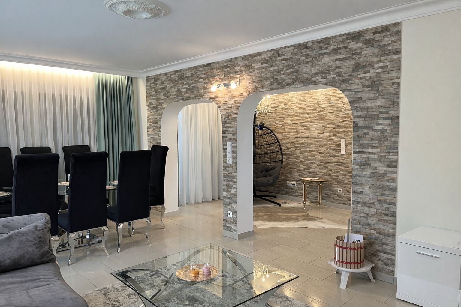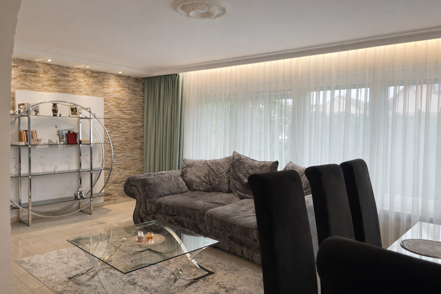 Herzstück des Hauses ist der großzügige Wohn- und Essbereich, der mit seiner offenen Gestaltung und der direkten Verbindung zur Terrasse ein einladendes Ambiente schafft. Große Fensterflächen sorgen für viel Tageslicht und eine angenehme Wohnatmosphäre. Die moderne Einbauküche fügt sich harmonisch in das Gesamtbild ein und bietet beste Voraussetzungen für gemeinsames Kochen und gesellige Abende.