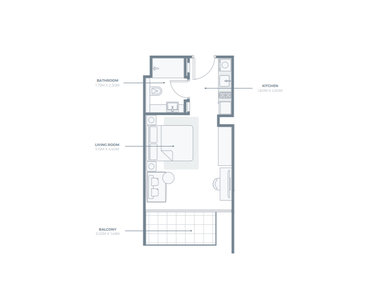 Mit einer voll ausgestatteten Küche mit Edelstahlgeräten, einem geräumigen Wohnbereich mit großen Fenstern, die viel natürliches Licht hereinlassen, und einer gemütlichen Schlafecke hat diese Wohnung alles, was ein Junggeselle braucht. Das schlichte Badezimmer mit modernen Armaturen trägt zum luxuriösen Gefühl der Wohnung bei.