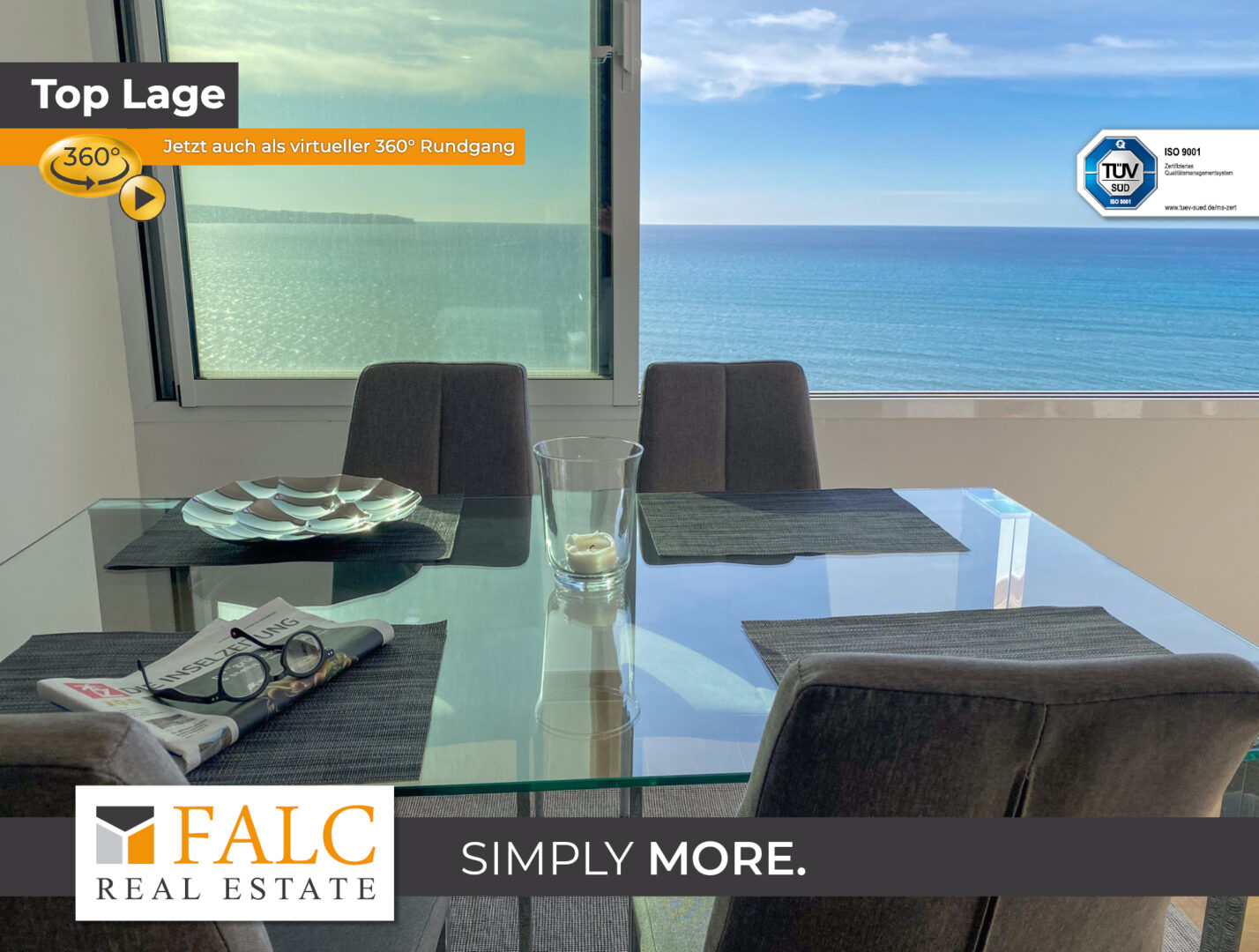 Die verglaste Terrasse ist ein Highlight der Wohnung. Mit hochwertigen, wetterfesten Möbeln ausgestattet, dient sie als zusätzlicher Wohnraum, der das ganze Jahr über genutzt werden kann. Von hier aus können die Bewohner die Schönheit des Meeres und die malerischen Sonnenuntergänge genießen.