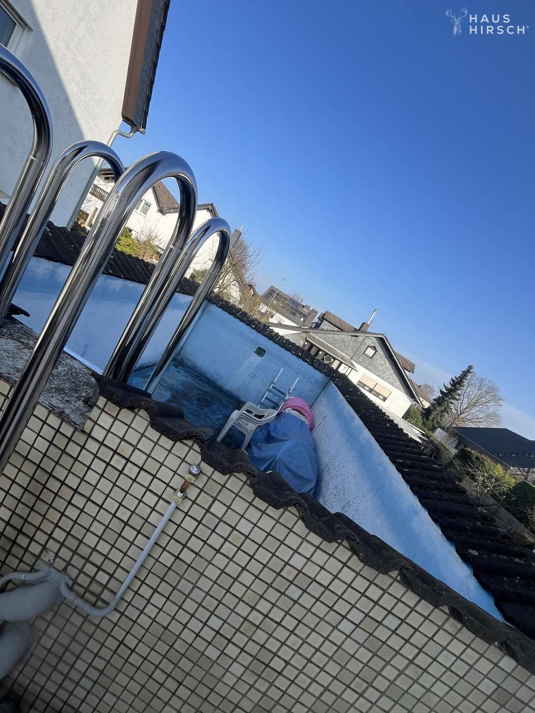 Großer Garten + Außen-Pool auf der Garage → ein Erlebnis- und Freizeitwert, der in der Region selten ist. Pool lässt sich reaktivieren bzw. modern gestalten.