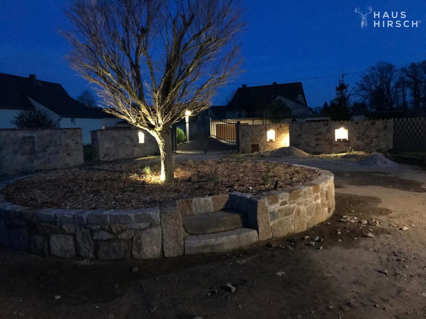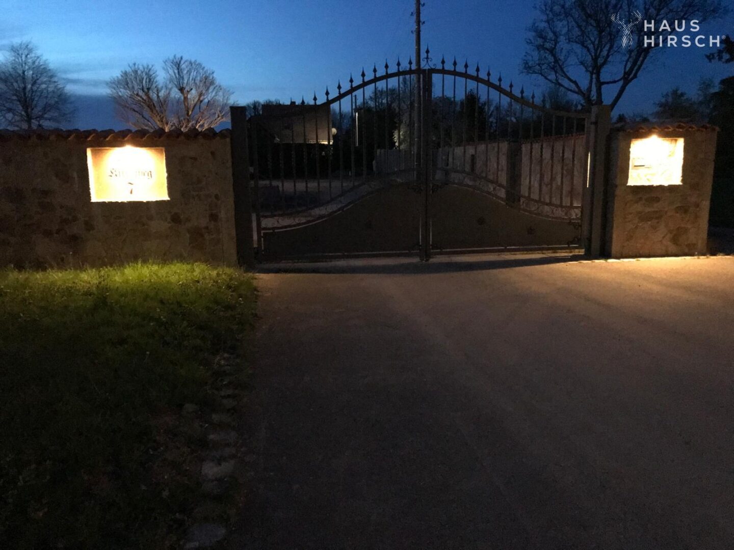 Alle Wege sind gepflastert und der Garten ist mit gepflegten Rasen bewachsen.