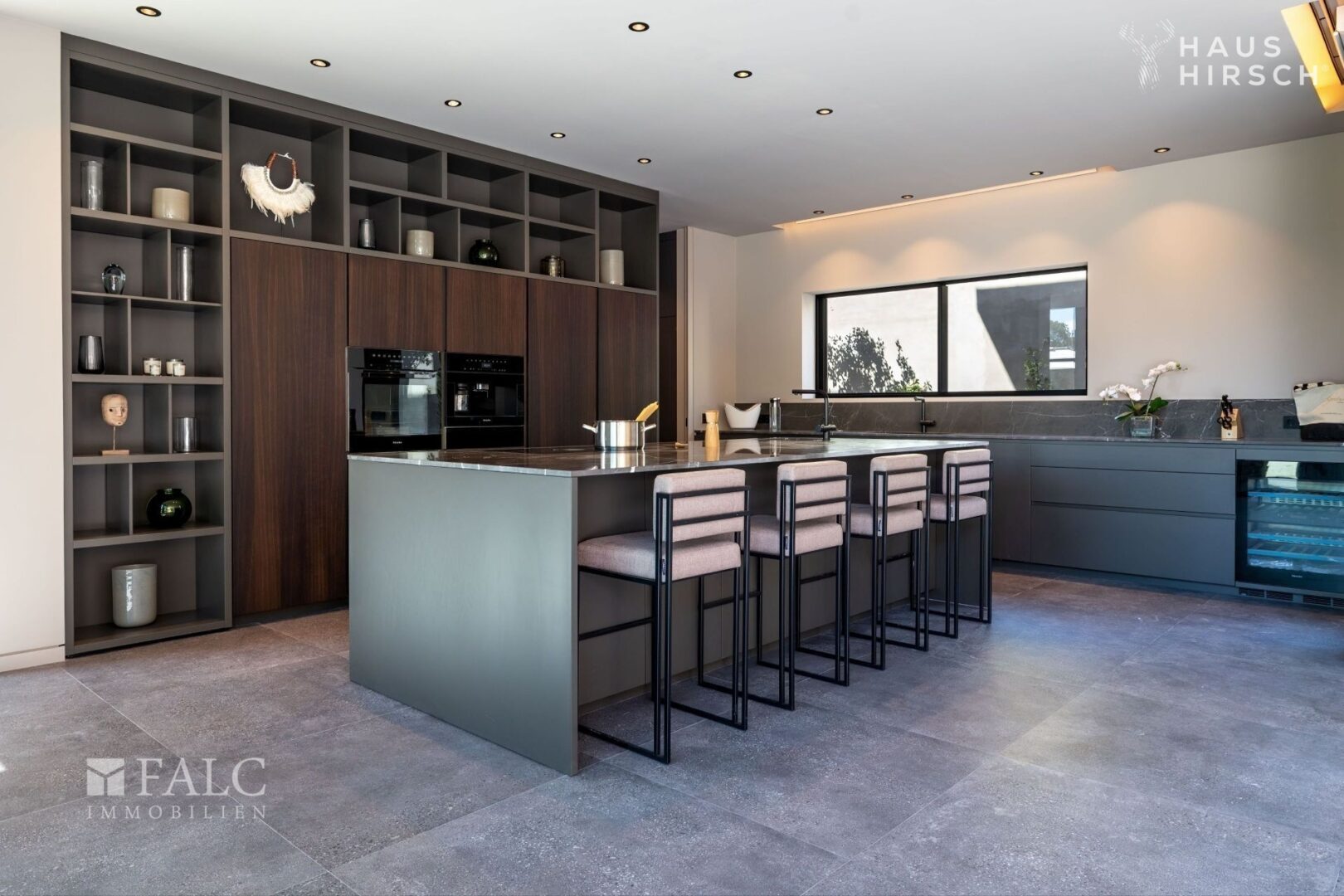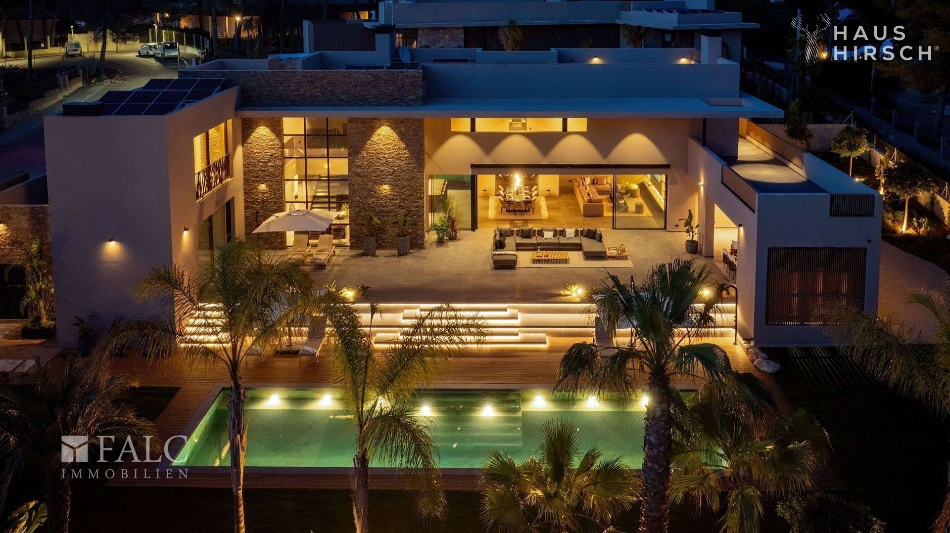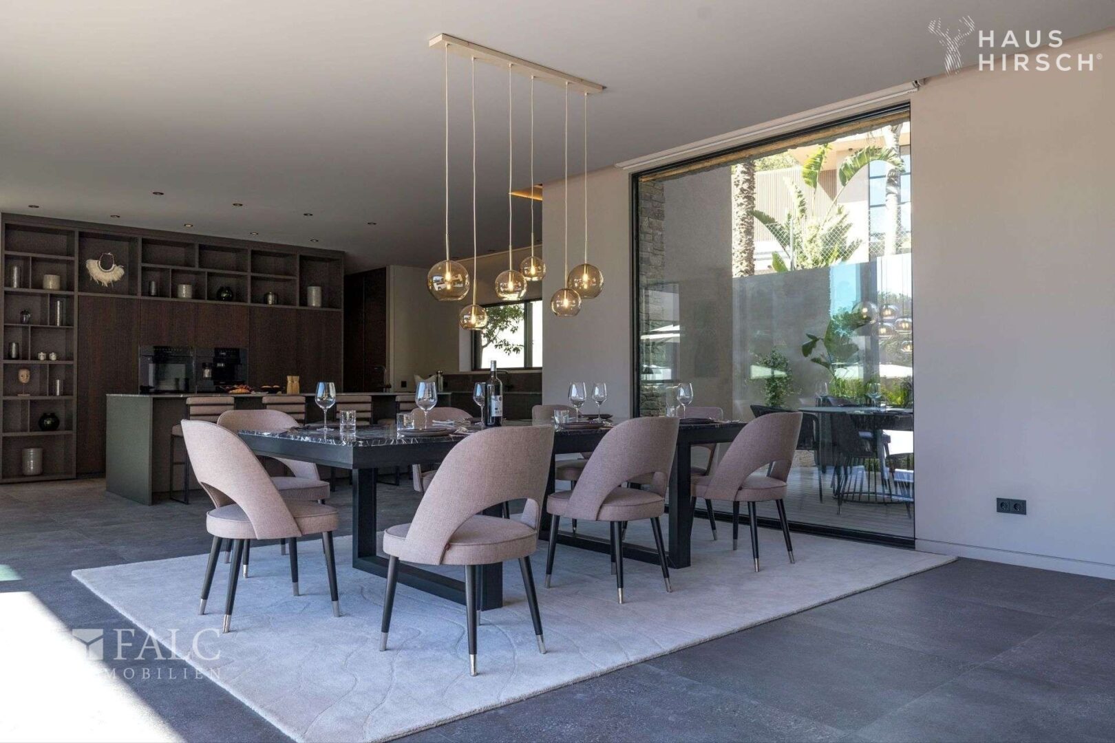 Im Mittelpunkt der Villa steht die elegante Poliform-Küche mit edlen Marmor-Arbeitsflächen und modernster Ausstattung. Der angrenzende Essbereich ist der perfekte Ort für kulinarische Erlebnisse, während das großzügige Wohnzimmer mit herrlichem Blick die perfekte Ruhezone bietet, von der aus man direkt auf die Terrassen und den privaten Poolbereich gelangt.