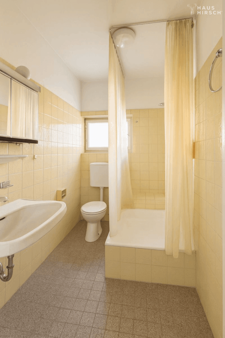 Auch die Wand zwischen der separaten Küche und dem angrenzenden Bad lässt sich nach statischer Prüfung entfernen, sodass hier ein großzügiger, zeitgemäßer Badbereich entstehen könnte.