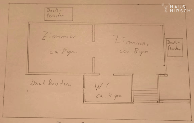 Das Dachgeschoss mit zusätzlich insgesamt ca. 18,67 m² verfügt über zwei wohnlich genutzte Zimmer sowie ein separates WC. Die Räume bieten zusätzliche Nutzungsmöglichkeiten, beispielsweise als Arbeitsbereiche, Hobbyräume oder Rückzugsorte, und ergänzen das Raumangebot sinnvoll.