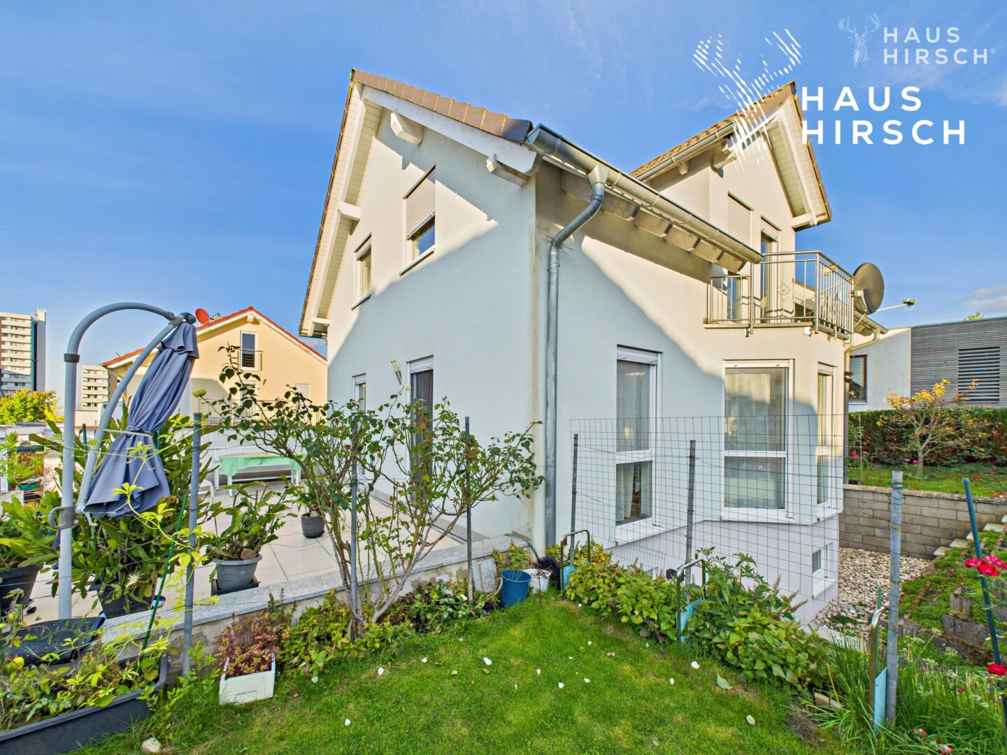 Auf dem 408 m² großen Grundstück erwarten Sie ein sonniger Garten, eine große Terrasse, ein Balkon im Obergeschoss, eine Garage mit Abstellraum sowie zwei Außenstellplätze.