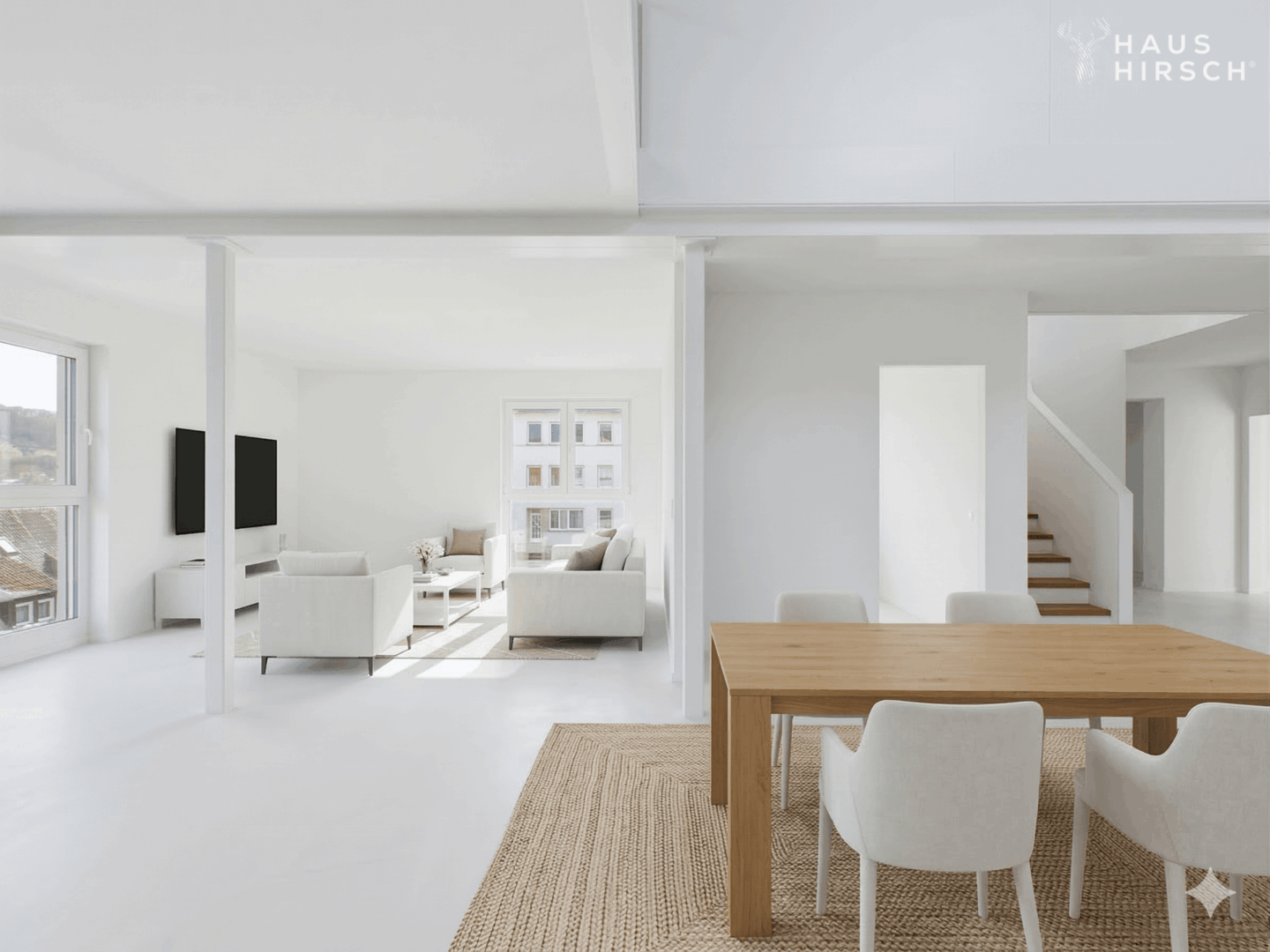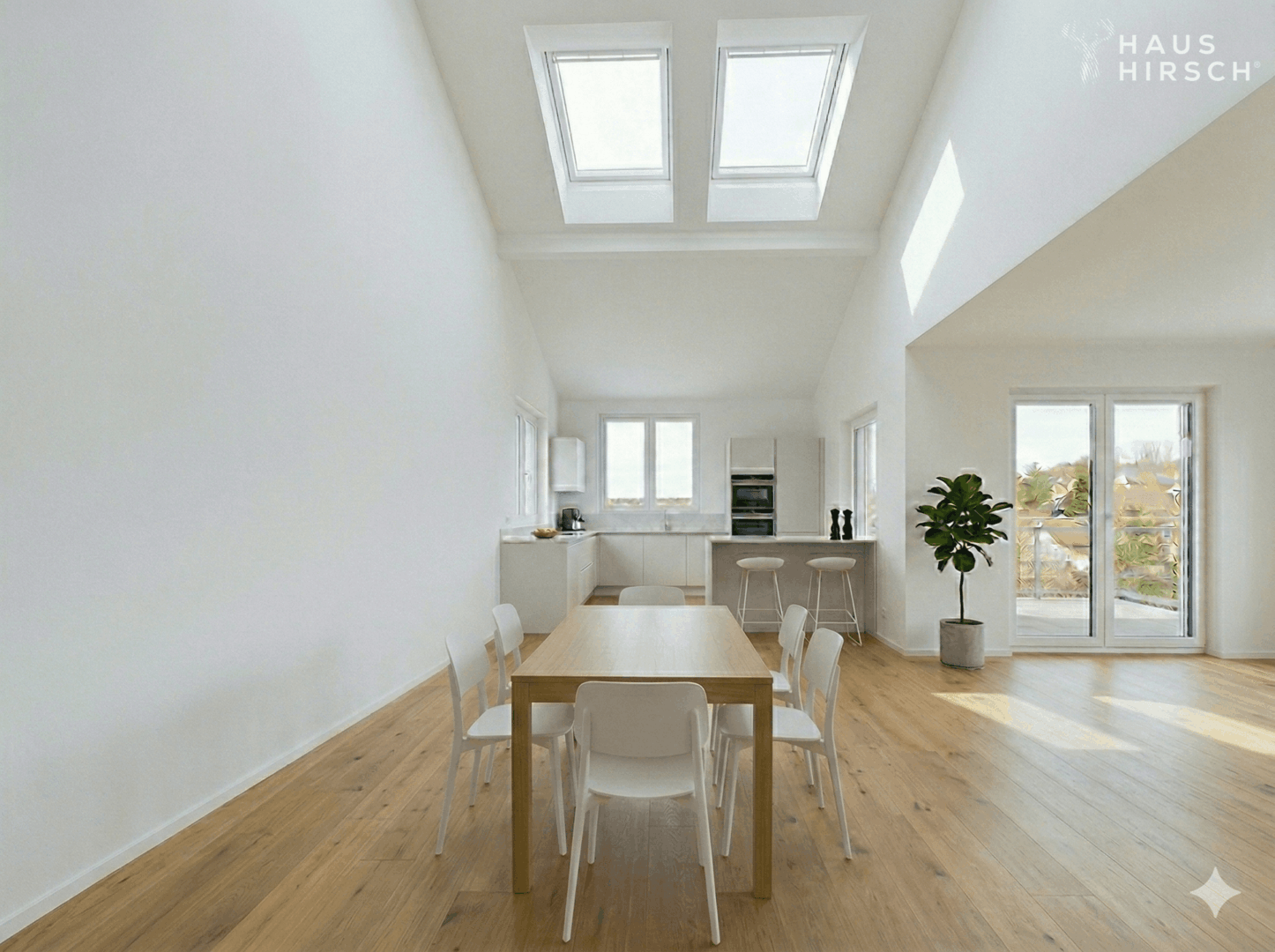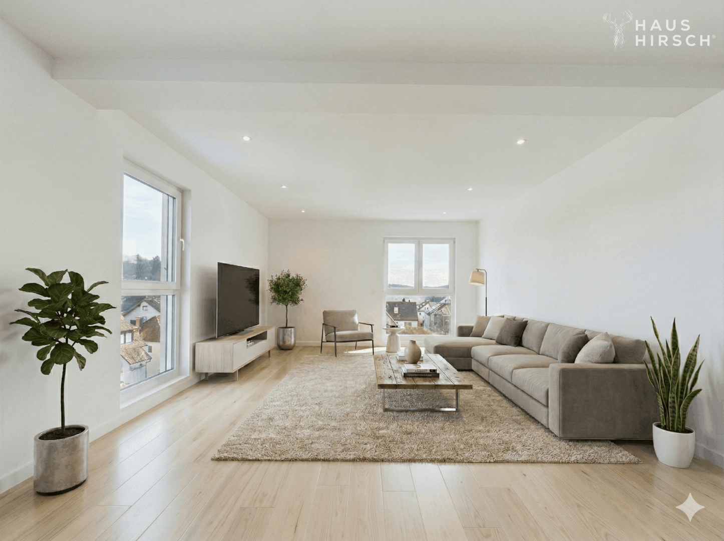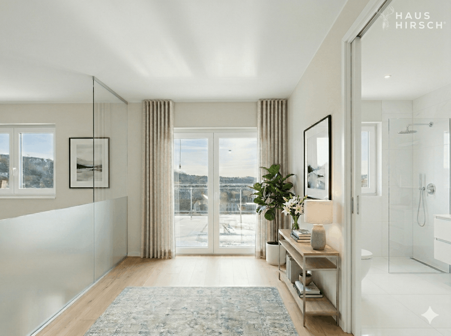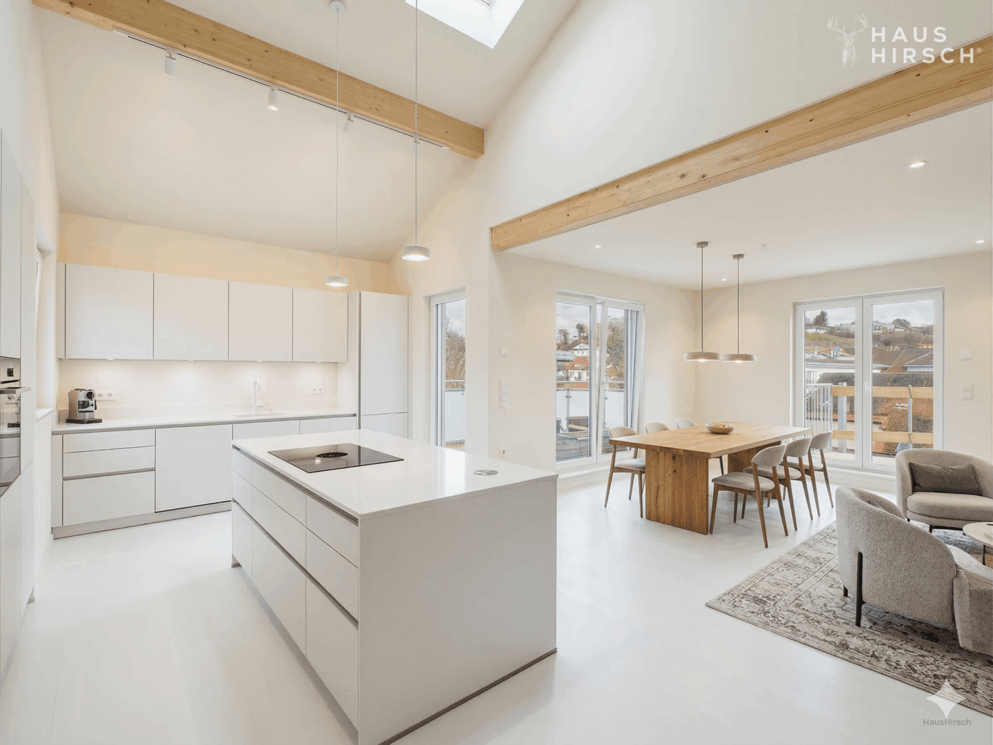 Edles Vinyl verleiht den Wohnräumen eine warme, elegante Ausstrahlung und bildet die perfekte Grundlage für ein stilvolles Interior-Konzept. Großzügige Fensterflächen sorgen für ein lichtdurchflutetes Ambiente und unterstreichen den offenen Charakter dieser besonderen Wohnung.
