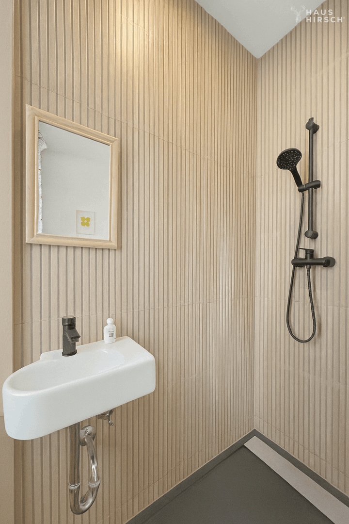 Das Apartment besticht durch eine großzügige Wohnküche sowie ein separates Schlafzimmer, das mit einer integrierten Dusche einen besonderen, hotelähnlichen Charme versprüht. Das WC ist praktisch vom Flur aus erreichbar.