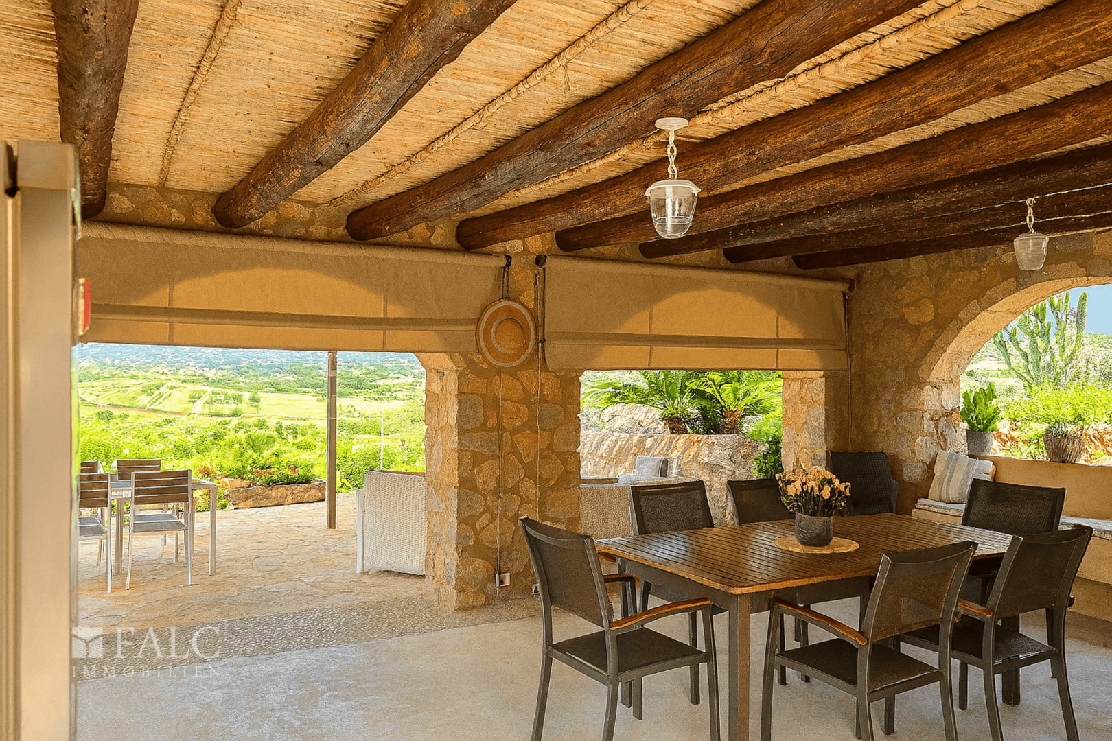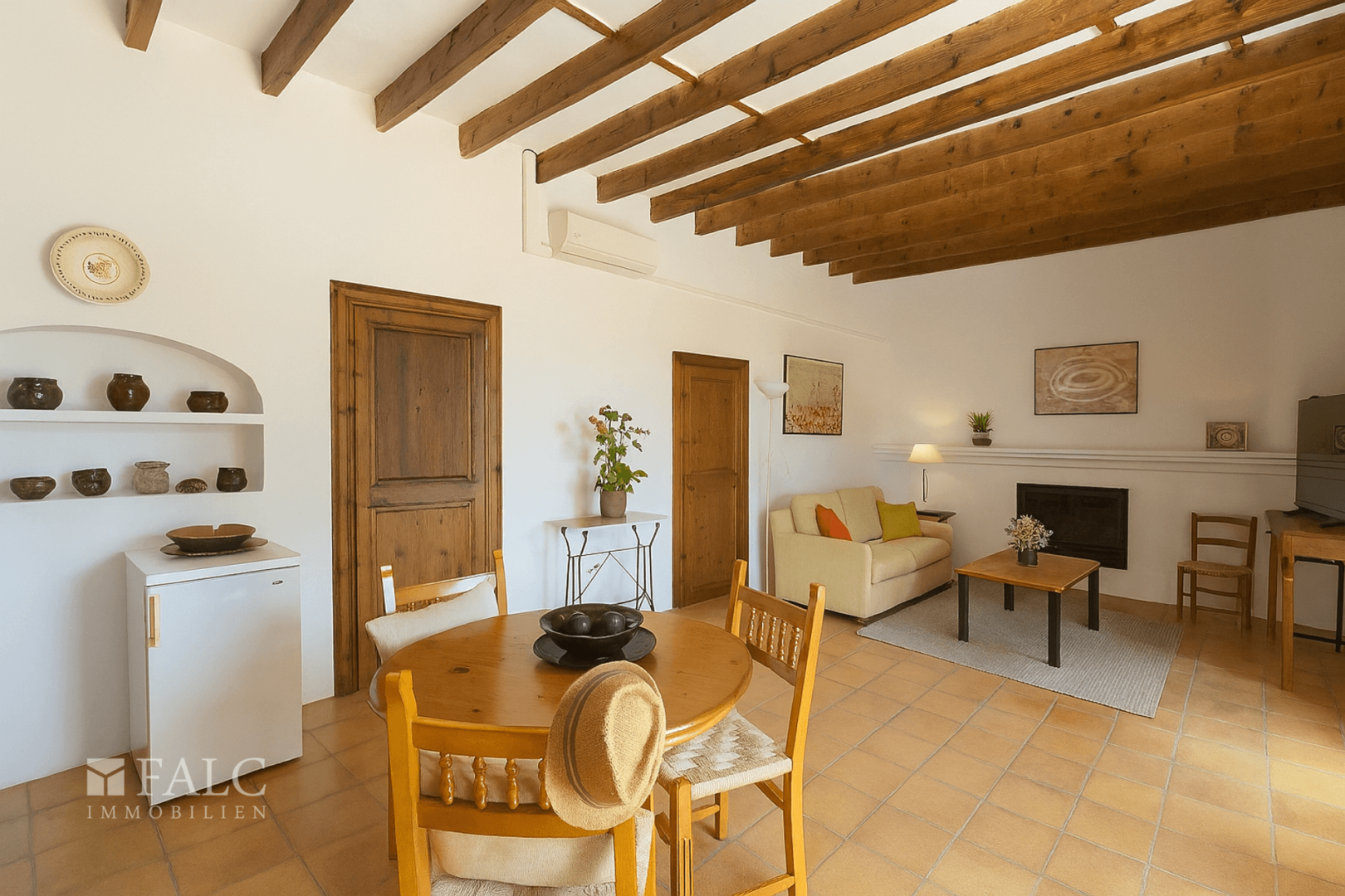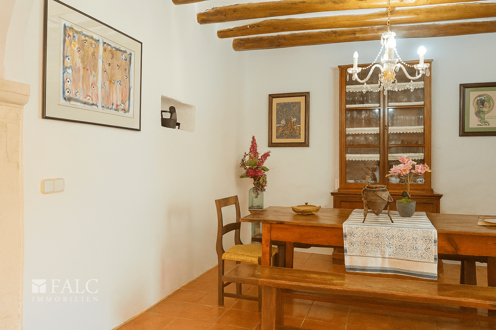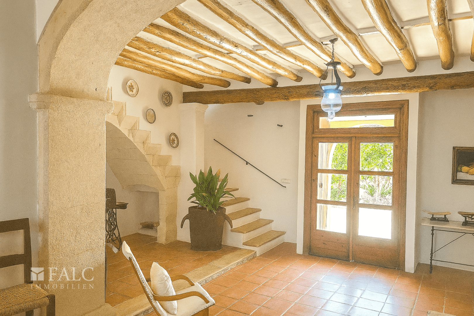 Das Haupthaus, im klassischen Stil eines Landhauses, versprüht mallorquinischen Charme durch und durch – mit Natursteinwänden, rustikalen Holzbalken und liebevollen Details, die Geschichte erzählen.